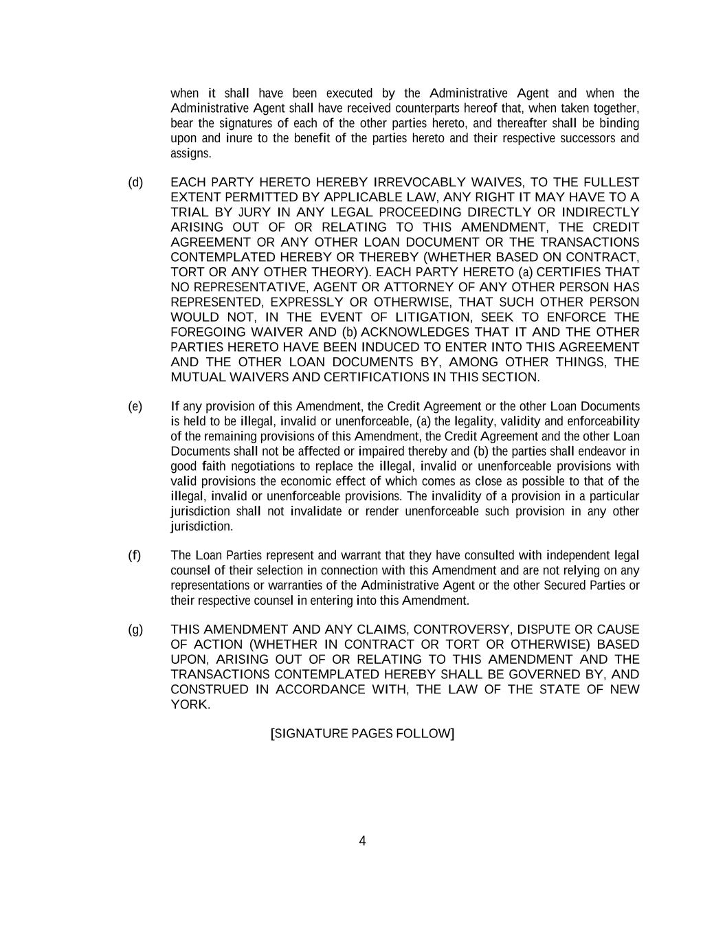 4 when it shall have been executed by the Administrative Agent and when the Administrative Agent shall have received counterparts hereof that, when taken together, bear the signatures of each of the other parties hereto, and thereafter shall be binding upon and inure to the benefit of the parties hereto and their respective successors and assigns. (d) EACH PARTY HERETO HEREBY IRREVOCABLY WAIVES, TO THE FULLEST EXTENT PERMITTED BY APPLICABLE LAW, ANY RIGHT IT MAY HAVE TO A TRIAL BY JURY IN ANY LEGAL PROCEEDING DIRECTLY OR INDIRECTLY ARISING OUT OF OR RELATING TO THIS AMENDMENT, THE CREDIT AGREEMENT OR ANY OTHER LOAN DOCUMENT OR THE TRANSACTIONS CONTEMPLATED HEREBY OR THEREBY (WHETHER BASED ON CONTRACT, TORT OR ANY OTHER THEORY). EACH PARTY HERETO (a) CERTIFIES THAT NO REPRESENTATIVE, AGENT OR ATTORNEY OF ANY OTHER PERSON HAS REPRESENTED, EXPRESSLY OR OTHERWISE, THAT SUCH OTHER PERSON WOULD NOT, IN THE EVENT OF LITIGATION, SEEK TO ENFORCE THE FOREGOING WAIVER AND (b) ACKNOWLEDGES THAT IT AND THE OTHER PARTIES HERETO HAVE BEEN INDUCED TO ENTER INTO THIS AGREEMENT AND THE OTHER LOAN DOCUMENTS BY, AMONG OTHER THINGS, THE MUTUAL WAIVERS AND CERTIFICATIONS IN THIS SECTION. (e) If any provision of this Amendment, the Credit Agreement or the other Loan Documents is held to be illegal, invalid or unenforceable, (a) the legality, validity and enforceability of the remaining provisions of this Amendment, the Credit Agreement and the other Loan Documents shall not be affected or impaired thereby and (b) the parties shall endeavor in good faith negotiations to replace the illegal, invalid or unenforceable provisions with valid provisions the economic effect of which comes as close as possible to that of the illegal, invalid or unenforceable provisions. The invalidity of a provision in a particular jurisdiction shall not invalidate or render unenforceable such provision in any other jurisdiction. (f) The Loan Parties represent and warrant that they have consulted with independent legal counsel of their selection in connection with this Amendment and are not relying on any representations or warranties of the Administrative Agent or the other Secured Parties or their respective counsel in entering into this Amendment. (g) THIS AMENDMENT AND ANY CLAIMS, CONTROVERSY, DISPUTE OR CAUSE OF ACTION (WHETHER IN CONTRACT OR TORT OR OTHERWISE) BASED UPON, ARISING OUT OF OR RELATING TO THIS AMENDMENT AND THE TRANSACTIONS CONTEMPLATED HEREBY SHALL BE GOVERNED BY, AND CONSTRUED IN ACCORDANCE WITH, THE LAW OF THE STATE OF NEW YORK. [SIGNATURE PAGES FOLLOW]