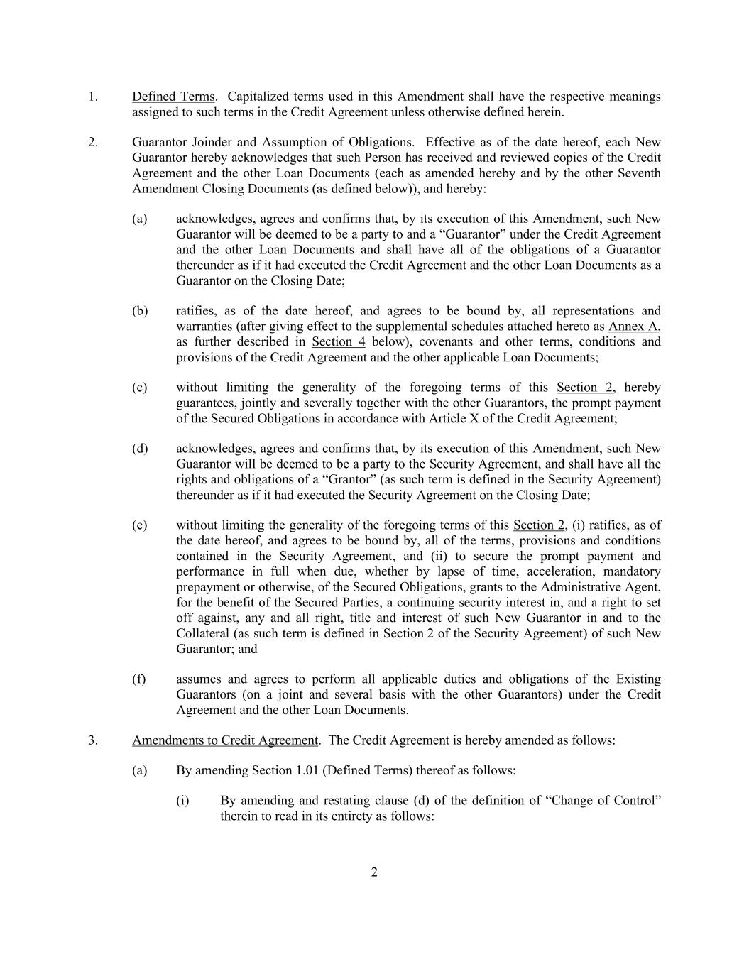 2 1. Defined Terms. Capitalized terms used in this Amendment shall have the respective meanings assigned to such terms in the Credit Agreement unless otherwise defined herein. 2. Guarantor Joinder and Assumption of Obligations. Effective as of the date hereof, each New Guarantor hereby acknowledges that such Person has received and reviewed copies of the Credit Agreement and the other Loan Documents (each as amended hereby and by the other Seventh Amendment Closing Documents (as defined below)), and hereby: (a) acknowledges, agrees and confirms that, by its execution of this Amendment, such New Guarantor will be deemed to be a party to and a “Guarantor” under the Credit Agreement and the other Loan Documents and shall have all of the obligations of a Guarantor thereunder as if it had executed the Credit Agreement and the other Loan Documents as a Guarantor on the Closing Date; (b) ratifies, as of the date hereof, and agrees to be bound by, all representations and warranties (after giving effect to the supplemental schedules attached hereto as Annex A, as further described in Section 4 below), covenants and other terms, conditions and provisions of the Credit Agreement and the other applicable Loan Documents; (c) without limiting the generality of the foregoing terms of this Section 2, hereby guarantees, jointly and severally together with the other Guarantors, the prompt payment of the Secured Obligations in accordance with Article X of the Credit Agreement; (d) acknowledges, agrees and confirms that, by its execution of this Amendment, such New Guarantor will be deemed to be a party to the Security Agreement, and shall have all the rights and obligations of a “Grantor” (as such term is defined in the Security Agreement) thereunder as if it had executed the Security Agreement on the Closing Date; (e) without limiting the generality of the foregoing terms of this Section 2, (i) ratifies, as of the date hereof, and agrees to be bound by, all of the terms, provisions and conditions contained in the Security Agreement, and (ii) to secure the prompt payment and performance in full when due, whether by lapse of time, acceleration, mandatory prepayment or otherwise, of the Secured Obligations, grants to the Administrative Agent, for the benefit of the Secured Parties, a continuing security interest in, and a right to set off against, any and all right, title and interest of such New Guarantor in and to the Collateral (as such term is defined in Section 2 of the Security Agreement) of such New Guarantor; and (f) assumes and agrees to perform all applicable duties and obligations of the Existing Guarantors (on a joint and several basis with the other Guarantors) under the Credit Agreement and the other Loan Documents. 3. Amendments to Credit Agreement. The Credit Agreement is hereby amended as follows: (a) By amending Section 1.01 (Defined Terms) thereof as follows: (i) By amending and restating clause (d) of the definition of “Change of Control” therein to read in its entirety as follows: