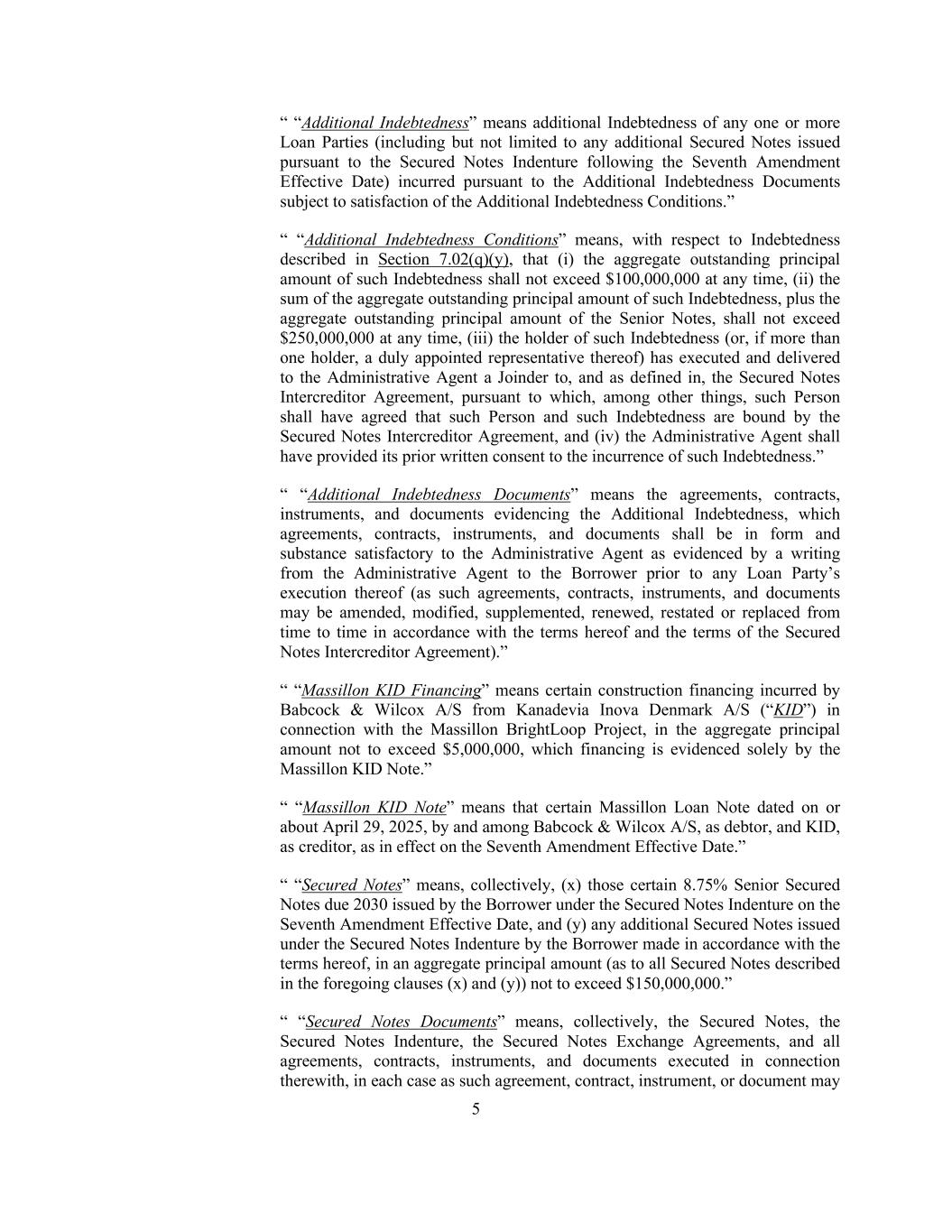 5 “ “Additional Indebtedness” means additional Indebtedness of any one or more Loan Parties (including but not limited to any additional Secured Notes issued pursuant to the Secured Notes Indenture following the Seventh Amendment Effective Date) incurred pursuant to the Additional Indebtedness Documents subject to satisfaction of the Additional Indebtedness Conditions.” “ “Additional Indebtedness Conditions” means, with respect to Indebtedness described in Section 7.02(q)(y), that (i) the aggregate outstanding principal amount of such Indebtedness shall not exceed $100,000,000 at any time, (ii) the sum of the aggregate outstanding principal amount of such Indebtedness, plus the aggregate outstanding principal amount of the Senior Notes, shall not exceed $250,000,000 at any time, (iii) the holder of such Indebtedness (or, if more than one holder, a duly appointed representative thereof) has executed and delivered to the Administrative Agent a Joinder to, and as defined in, the Secured Notes Intercreditor Agreement, pursuant to which, among other things, such Person shall have agreed that such Person and such Indebtedness are bound by the Secured Notes Intercreditor Agreement, and (iv) the Administrative Agent shall have provided its prior written consent to the incurrence of such Indebtedness.” “ “Additional Indebtedness Documents” means the agreements, contracts, instruments, and documents evidencing the Additional Indebtedness, which agreements, contracts, instruments, and documents shall be in form and substance satisfactory to the Administrative Agent as evidenced by a writing from the Administrative Agent to the Borrower prior to any Loan Party’s execution thereof (as such agreements, contracts, instruments, and documents may be amended, modified, supplemented, renewed, restated or replaced from time to time in accordance with the terms hereof and the terms of the Secured Notes Intercreditor Agreement).” “ “Massillon KID Financing” means certain construction financing incurred by Babcock & Wilcox A/S from Kanadevia Inova Denmark A/S (“KID”) in connection with the Massillon BrightLoop Project, in the aggregate principal amount not to exceed $5,000,000, which financing is evidenced solely by the Massillon KID Note.” “ “Massillon KID Note” means that certain Massillon Loan Note dated on or about April 29, 2025, by and among Babcock & Wilcox A/S, as debtor, and KID, as creditor, as in effect on the Seventh Amendment Effective Date.” “ “Secured Notes” means, collectively, (x) those certain 8.75% Senior Secured Notes due 2030 issued by the Borrower under the Secured Notes Indenture on the Seventh Amendment Effective Date, and (y) any additional Secured Notes issued under the Secured Notes Indenture by the Borrower made in accordance with the terms hereof, in an aggregate principal amount (as to all Secured Notes described in the foregoing clauses (x) and (y)) not to exceed $150,000,000.” “ “Secured Notes Documents” means, collectively, the Secured Notes, the Secured Notes Indenture, the Secured Notes Exchange Agreements, and all agreements, contracts, instruments, and documents executed in connection therewith, in each case as such agreement, contract, instrument, or document may