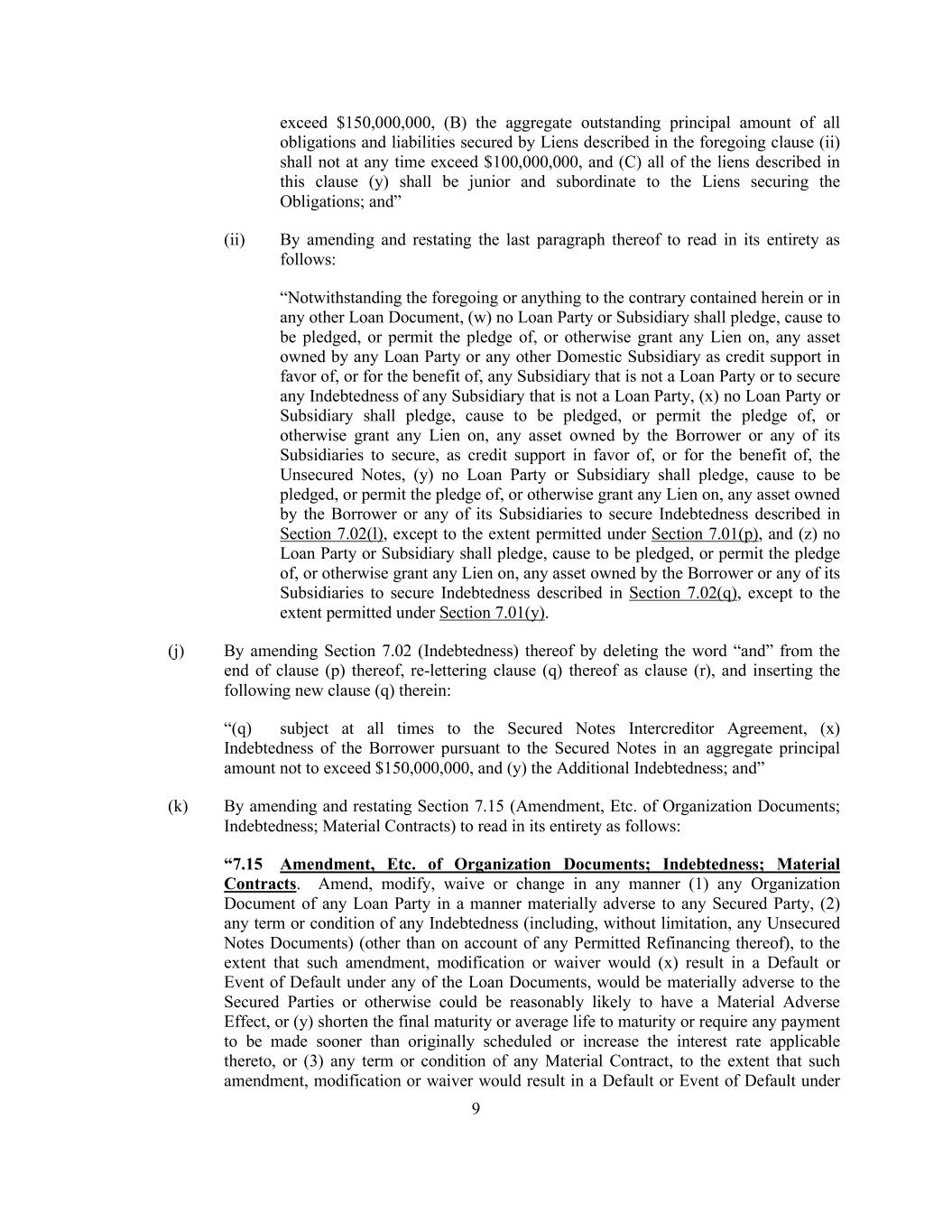 9 exceed $150,000,000, (B) the aggregate outstanding principal amount of all obligations and liabilities secured by Liens described in the foregoing clause (ii) shall not at any time exceed $100,000,000, and (C) all of the liens described in this clause (y) shall be junior and subordinate to the Liens securing the Obligations; and” (ii) By amending and restating the last paragraph thereof to read in its entirety as follows: “Notwithstanding the foregoing or anything to the contrary contained herein or in any other Loan Document, (w) no Loan Party or Subsidiary shall pledge, cause to be pledged, or permit the pledge of, or otherwise grant any Lien on, any asset owned by any Loan Party or any other Domestic Subsidiary as credit support in favor of, or for the benefit of, any Subsidiary that is not a Loan Party or to secure any Indebtedness of any Subsidiary that is not a Loan Party, (x) no Loan Party or Subsidiary shall pledge, cause to be pledged, or permit the pledge of, or otherwise grant any Lien on, any asset owned by the Borrower or any of its Subsidiaries to secure, as credit support in favor of, or for the benefit of, the Unsecured Notes, (y) no Loan Party or Subsidiary shall pledge, cause to be pledged, or permit the pledge of, or otherwise grant any Lien on, any asset owned by the Borrower or any of its Subsidiaries to secure Indebtedness described in Section 7.02(l), except to the extent permitted under Section 7.01(p), and (z) no Loan Party or Subsidiary shall pledge, cause to be pledged, or permit the pledge of, or otherwise grant any Lien on, any asset owned by the Borrower or any of its Subsidiaries to secure Indebtedness described in Section 7.02(q), except to the extent permitted under Section 7.01(y). (j) By amending Section 7.02 (Indebtedness) thereof by deleting the word “and” from the end of clause (p) thereof, re-lettering clause (q) thereof as clause (r), and inserting the following new clause (q) therein: “(q) subject at all times to the Secured Notes Intercreditor Agreement, (x) Indebtedness of the Borrower pursuant to the Secured Notes in an aggregate principal amount not to exceed $150,000,000, and (y) the Additional Indebtedness; and” (k) By amending and restating Section 7.15 (Amendment, Etc. of Organization Documents; Indebtedness; Material Contracts) to read in its entirety as follows: “7.15 Amendment, Etc. of Organization Documents; Indebtedness; Material Contracts. Amend, modify, waive or change in any manner (1) any Organization Document of any Loan Party in a manner materially adverse to any Secured Party, (2) any term or condition of any Indebtedness (including, without limitation, any Unsecured Notes Documents) (other than on account of any Permitted Refinancing thereof), to the extent that such amendment, modification or waiver would (x) result in a Default or Event of Default under any of the Loan Documents, would be materially adverse to the Secured Parties or otherwise could be reasonably likely to have a Material Adverse Effect, or (y) shorten the final maturity or average life to maturity or require any payment to be made sooner than originally scheduled or increase the interest rate applicable thereto, or (3) any term or condition of any Material Contract, to the extent that such amendment, modification or waiver would result in a Default or Event of Default under
