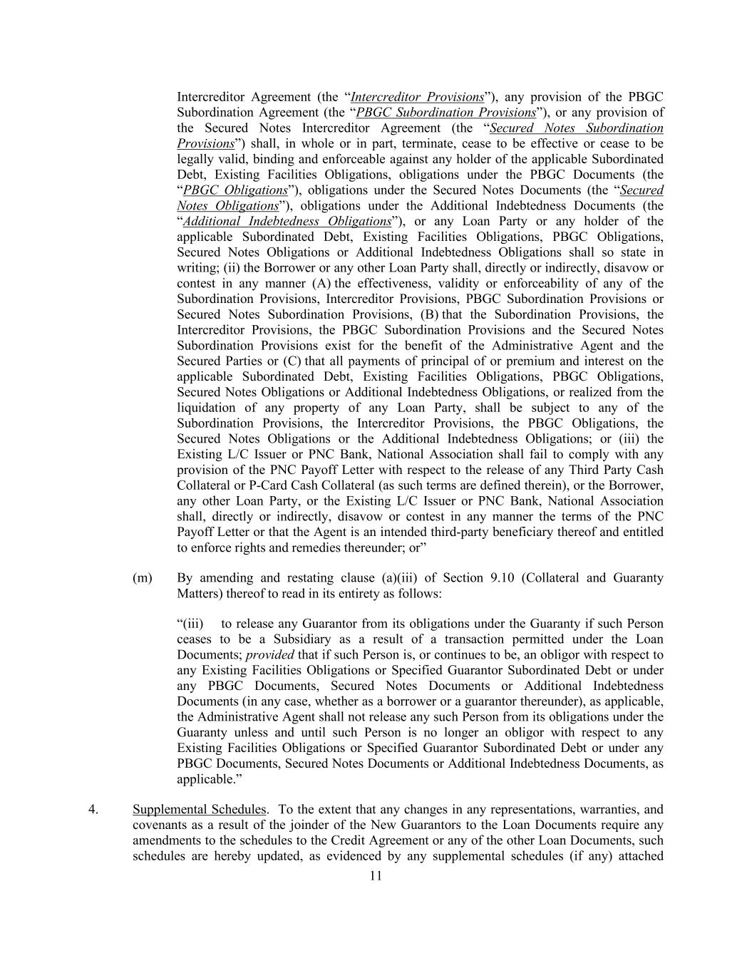 11 Intercreditor Agreement (the “Intercreditor Provisions”), any provision of the PBGC Subordination Agreement (the “PBGC Subordination Provisions”), or any provision of the Secured Notes Intercreditor Agreement (the “Secured Notes Subordination Provisions”) shall, in whole or in part, terminate, cease to be effective or cease to be legally valid, binding and enforceable against any holder of the applicable Subordinated Debt, Existing Facilities Obligations, obligations under the PBGC Documents (the “PBGC Obligations”), obligations under the Secured Notes Documents (the “Secured Notes Obligations”), obligations under the Additional Indebtedness Documents (the “Additional Indebtedness Obligations”), or any Loan Party or any holder of the applicable Subordinated Debt, Existing Facilities Obligations, PBGC Obligations, Secured Notes Obligations or Additional Indebtedness Obligations shall so state in writing; (ii) the Borrower or any other Loan Party shall, directly or indirectly, disavow or contest in any manner (A) the effectiveness, validity or enforceability of any of the Subordination Provisions, Intercreditor Provisions, PBGC Subordination Provisions or Secured Notes Subordination Provisions, (B) that the Subordination Provisions, the Intercreditor Provisions, the PBGC Subordination Provisions and the Secured Notes Subordination Provisions exist for the benefit of the Administrative Agent and the Secured Parties or (C) that all payments of principal of or premium and interest on the applicable Subordinated Debt, Existing Facilities Obligations, PBGC Obligations, Secured Notes Obligations or Additional Indebtedness Obligations, or realized from the liquidation of any property of any Loan Party, shall be subject to any of the Subordination Provisions, the Intercreditor Provisions, the PBGC Obligations, the Secured Notes Obligations or the Additional Indebtedness Obligations; or (iii) the Existing L/C Issuer or PNC Bank, National Association shall fail to comply with any provision of the PNC Payoff Letter with respect to the release of any Third Party Cash Collateral or P-Card Cash Collateral (as such terms are defined therein), or the Borrower, any other Loan Party, or the Existing L/C Issuer or PNC Bank, National Association shall, directly or indirectly, disavow or contest in any manner the terms of the PNC Payoff Letter or that the Agent is an intended third-party beneficiary thereof and entitled to enforce rights and remedies thereunder; or” (m) By amending and restating clause (a)(iii) of Section 9.10 (Collateral and Guaranty Matters) thereof to read in its entirety as follows: “(iii) to release any Guarantor from its obligations under the Guaranty if such Person ceases to be a Subsidiary as a result of a transaction permitted under the Loan Documents; provided that if such Person is, or continues to be, an obligor with respect to any Existing Facilities Obligations or Specified Guarantor Subordinated Debt or under any PBGC Documents, Secured Notes Documents or Additional Indebtedness Documents (in any case, whether as a borrower or a guarantor thereunder), as applicable, the Administrative Agent shall not release any such Person from its obligations under the Guaranty unless and until such Person is no longer an obligor with respect to any Existing Facilities Obligations or Specified Guarantor Subordinated Debt or under any PBGC Documents, Secured Notes Documents or Additional Indebtedness Documents, as applicable.” 4. Supplemental Schedules. To the extent that any changes in any representations, warranties, and covenants as a result of the joinder of the New Guarantors to the Loan Documents require any amendments to the schedules to the Credit Agreement or any of the other Loan Documents, such schedules are hereby updated, as evidenced by any supplemental schedules (if any) attached