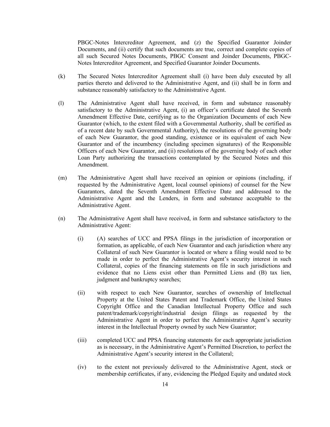 14 PBGC-Notes Intercreditor Agreement, and (z) the Specified Guarantor Joinder Documents, and (ii) certify that such documents are true, correct and complete copies of all such Secured Notes Documents, PBGC Consent and Joinder Documents, PBGC- Notes Intercreditor Agreement, and Specified Guarantor Joinder Documents. (k) The Secured Notes Intercreditor Agreement shall (i) have been duly executed by all parties thereto and delivered to the Administrative Agent, and (ii) shall be in form and substance reasonably satisfactory to the Administrative Agent. (l) The Administrative Agent shall have received, in form and substance reasonably satisfactory to the Administrative Agent, (i) an officer’s certificate dated the Seventh Amendment Effective Date, certifying as to the Organization Documents of each New Guarantor (which, to the extent filed with a Governmental Authority, shall be certified as of a recent date by such Governmental Authority), the resolutions of the governing body of each New Guarantor, the good standing, existence or its equivalent of each New Guarantor and of the incumbency (including specimen signatures) of the Responsible Officers of each New Guarantor, and (ii) resolutions of the governing body of each other Loan Party authorizing the transactions contemplated by the Secured Notes and this Amendment. (m) The Administrative Agent shall have received an opinion or opinions (including, if requested by the Administrative Agent, local counsel opinions) of counsel for the New Guarantors, dated the Seventh Amendment Effective Date and addressed to the Administrative Agent and the Lenders, in form and substance acceptable to the Administrative Agent. (n) The Administrative Agent shall have received, in form and substance satisfactory to the Administrative Agent: (i) (A) searches of UCC and PPSA filings in the jurisdiction of incorporation or formation, as applicable, of each New Guarantor and each jurisdiction where any Collateral of such New Guarantor is located or where a filing would need to be made in order to perfect the Administrative Agent’s security interest in such Collateral, copies of the financing statements on file in such jurisdictions and evidence that no Liens exist other than Permitted Liens and (B) tax lien, judgment and bankruptcy searches; (ii) with respect to each New Guarantor, searches of ownership of Intellectual Property at the United States Patent and Trademark Office, the United States Copyright Office and the Canadian Intellectual Property Office and such patent/trademark/copyright/industrial design filings as requested by the Administrative Agent in order to perfect the Administrative Agent’s security interest in the Intellectual Property owned by such New Guarantor; (iii) completed UCC and PPSA financing statements for each appropriate jurisdiction as is necessary, in the Administrative Agent’s Permitted Discretion, to perfect the Administrative Agent’s security interest in the Collateral; (iv) to the extent not previously delivered to the Administrative Agent, stock or membership certificates, if any, evidencing the Pledged Equity and undated stock