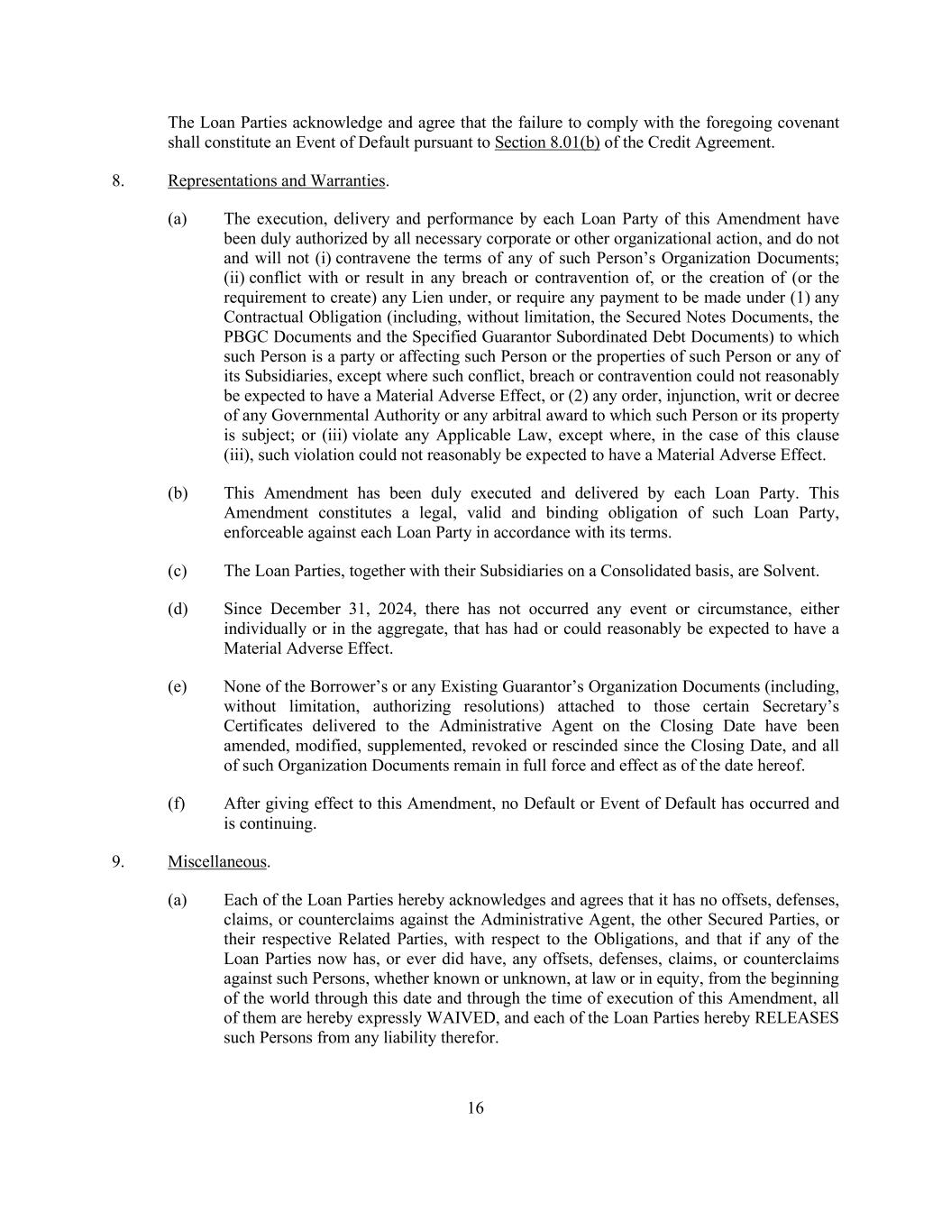 16 The Loan Parties acknowledge and agree that the failure to comply with the foregoing covenant shall constitute an Event of Default pursuant to Section 8.01(b) of the Credit Agreement. 8. Representations and Warranties. (a) The execution, delivery and performance by each Loan Party of this Amendment have been duly authorized by all necessary corporate or other organizational action, and do not and will not (i) contravene the terms of any of such Person’s Organization Documents; (ii) conflict with or result in any breach or contravention of, or the creation of (or the requirement to create) any Lien under, or require any payment to be made under (1) any Contractual Obligation (including, without limitation, the Secured Notes Documents, the PBGC Documents and the Specified Guarantor Subordinated Debt Documents) to which such Person is a party or affecting such Person or the properties of such Person or any of its Subsidiaries, except where such conflict, breach or contravention could not reasonably be expected to have a Material Adverse Effect, or (2) any order, injunction, writ or decree of any Governmental Authority or any arbitral award to which such Person or its property is subject; or (iii) violate any Applicable Law, except where, in the case of this clause (iii), such violation could not reasonably be expected to have a Material Adverse Effect. (b) This Amendment has been duly executed and delivered by each Loan Party. This Amendment constitutes a legal, valid and binding obligation of such Loan Party, enforceable against each Loan Party in accordance with its terms. (c) The Loan Parties, together with their Subsidiaries on a Consolidated basis, are Solvent. (d) Since December 31, 2024, there has not occurred any event or circumstance, either individually or in the aggregate, that has had or could reasonably be expected to have a Material Adverse Effect. (e) None of the Borrower’s or any Existing Guarantor’s Organization Documents (including, without limitation, authorizing resolutions) attached to those certain Secretary’s Certificates delivered to the Administrative Agent on the Closing Date have been amended, modified, supplemented, revoked or rescinded since the Closing Date, and all of such Organization Documents remain in full force and effect as of the date hereof. (f) After giving effect to this Amendment, no Default or Event of Default has occurred and is continuing. 9. Miscellaneous. (a) Each of the Loan Parties hereby acknowledges and agrees that it has no offsets, defenses, claims, or counterclaims against the Administrative Agent, the other Secured Parties, or their respective Related Parties, with respect to the Obligations, and that if any of the Loan Parties now has, or ever did have, any offsets, defenses, claims, or counterclaims against such Persons, whether known or unknown, at law or in equity, from the beginning of the world through this date and through the time of execution of this Amendment, all of them are hereby expressly WAIVED, and each of the Loan Parties hereby RELEASES such Persons from any liability therefor.