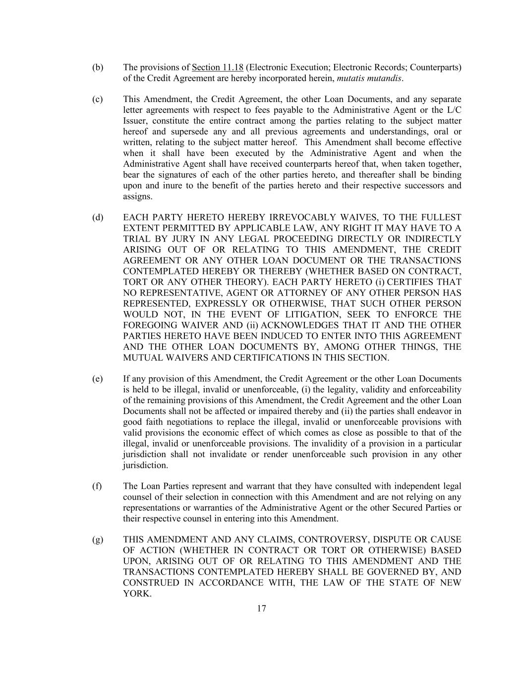 17 (b) The provisions of Section 11.18 (Electronic Execution; Electronic Records; Counterparts) of the Credit Agreement are hereby incorporated herein, mutatis mutandis. (c) This Amendment, the Credit Agreement, the other Loan Documents, and any separate letter agreements with respect to fees payable to the Administrative Agent or the L/C Issuer, constitute the entire contract among the parties relating to the subject matter hereof and supersede any and all previous agreements and understandings, oral or written, relating to the subject matter hereof. This Amendment shall become effective when it shall have been executed by the Administrative Agent and when the Administrative Agent shall have received counterparts hereof that, when taken together, bear the signatures of each of the other parties hereto, and thereafter shall be binding upon and inure to the benefit of the parties hereto and their respective successors and assigns. (d) EACH PARTY HERETO HEREBY IRREVOCABLY WAIVES, TO THE FULLEST EXTENT PERMITTED BY APPLICABLE LAW, ANY RIGHT IT MAY HAVE TO A TRIAL BY JURY IN ANY LEGAL PROCEEDING DIRECTLY OR INDIRECTLY ARISING OUT OF OR RELATING TO THIS AMENDMENT, THE CREDIT AGREEMENT OR ANY OTHER LOAN DOCUMENT OR THE TRANSACTIONS CONTEMPLATED HEREBY OR THEREBY (WHETHER BASED ON CONTRACT, TORT OR ANY OTHER THEORY). EACH PARTY HERETO (i) CERTIFIES THAT NO REPRESENTATIVE, AGENT OR ATTORNEY OF ANY OTHER PERSON HAS REPRESENTED, EXPRESSLY OR OTHERWISE, THAT SUCH OTHER PERSON WOULD NOT, IN THE EVENT OF LITIGATION, SEEK TO ENFORCE THE FOREGOING WAIVER AND (ii) ACKNOWLEDGES THAT IT AND THE OTHER PARTIES HERETO HAVE BEEN INDUCED TO ENTER INTO THIS AGREEMENT AND THE OTHER LOAN DOCUMENTS BY, AMONG OTHER THINGS, THE MUTUAL WAIVERS AND CERTIFICATIONS IN THIS SECTION. (e) If any provision of this Amendment, the Credit Agreement or the other Loan Documents is held to be illegal, invalid or unenforceable, (i) the legality, validity and enforceability of the remaining provisions of this Amendment, the Credit Agreement and the other Loan Documents shall not be affected or impaired thereby and (ii) the parties shall endeavor in good faith negotiations to replace the illegal, invalid or unenforceable provisions with valid provisions the economic effect of which comes as close as possible to that of the illegal, invalid or unenforceable provisions. The invalidity of a provision in a particular jurisdiction shall not invalidate or render unenforceable such provision in any other jurisdiction. (f) The Loan Parties represent and warrant that they have consulted with independent legal counsel of their selection in connection with this Amendment and are not relying on any representations or warranties of the Administrative Agent or the other Secured Parties or their respective counsel in entering into this Amendment. (g) THIS AMENDMENT AND ANY CLAIMS, CONTROVERSY, DISPUTE OR CAUSE OF ACTION (WHETHER IN CONTRACT OR TORT OR OTHERWISE) BASED UPON, ARISING OUT OF OR RELATING TO THIS AMENDMENT AND THE TRANSACTIONS CONTEMPLATED HEREBY SHALL BE GOVERNED BY, AND CONSTRUED IN ACCORDANCE WITH, THE LAW OF THE STATE OF NEW YORK.