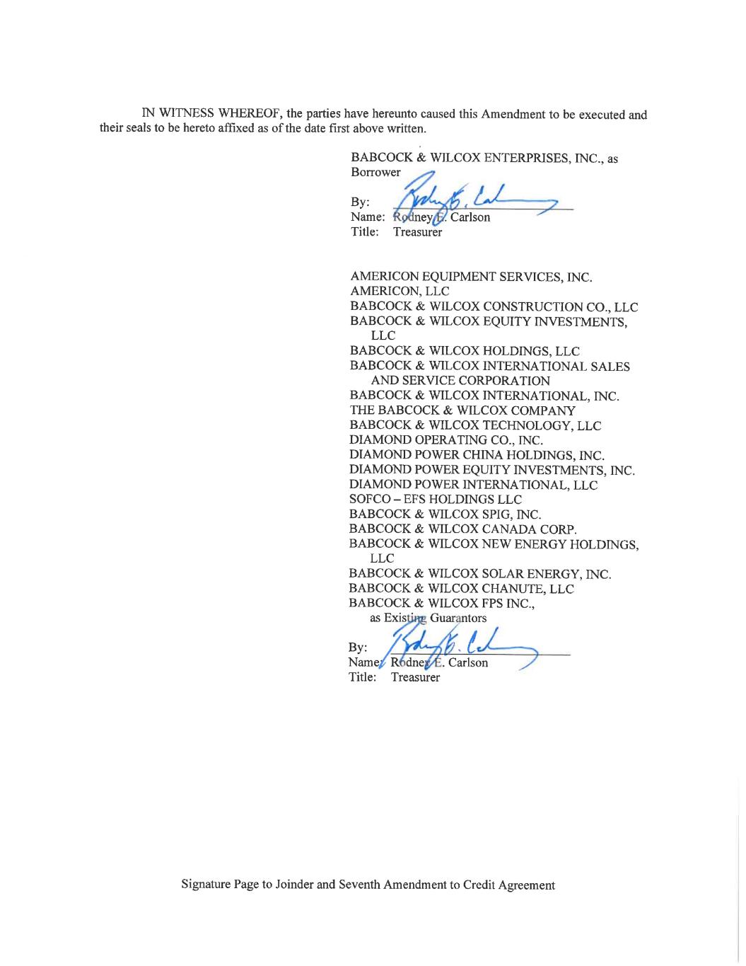 Execution Version JOINDER AND SEVENTH AMENDMENT TO CREDIT AGREEMENT This Joinder and Seventh Amendment to Credit Agreement (this “Amendment”) is made as of May 19, 2025, by and among: BABCOCK & WILCOX ENTERPRISES, INC., a Delaware corporation (the “Borrower”); the Persons named on Schedule I hereto (individually, an “Existing Guarantor”, and collectively, the “Existing Guarantors”); the Persons named on Schedule II hereto (individually, a “New Guarantor”, and collectively, the “New Guarantors”, and together with the Existing Guarantors, individually, a “Guarantor”, and collectively, the “Guarantors”; the Guarantors, together with the Borrower, are hereinafter referred to individually as a “Loan Party” and collectively as the “Loan Parties”); the LENDERS party hereto; and AXOS BANK, as Administrative Agent; in consideration of the mutual covenants herein contained and benefits to be derived herefrom. W I T N E S S E T H: WHEREAS, reference is made to that certain Credit Agreement, dated as of January 18, 2024 (as amended, modified, extended, restated, renewed, replaced, or supplemented from time to time, the “Credit Agreement”), by, among others, the Borrower, the Existing Guarantors, the Lenders party thereto from time to time, and Axos Bank, as Administrative Agent; WHEREAS, the Lenders, the Administrative Agent, the Borrower and the Existing Guarantors desire to cause the joinder of the New Guarantors to the Credit Agreement and the other Loan Documents as Guarantors thereunder; WHEREAS, the Borrowers and the Existing Guarantors have requested that the Administrative Agent and the Lenders agree to amend certain provisions of the Credit Agreement to, among other things, (i) permit the incurrence of the Secured Notes (as defined in the Credit Agreement after giving effect to this Amendment) and Liens on the Collateral to secure the Loan Parties’ obligations thereunder, subject in each case to the Secured Notes Intercreditor Agreement, and (ii) modify certain other terms of the Credit Agreement; WHEREAS, each of the New Guarantors desires to become a party to, and be bound by the terms of, the Credit Agreement and the other Loan Documents in the same capacity and to the same extent as the Existing Guarantors; WHEREAS, the New Guarantors are part of a corporate enterprise that includes the Borrower and the Existing Guarantors, and the New Guarantors recognize that they shall derive direct and indirect benefits from the credit facilities contemplated by the Credit Agreement and the other Loan Documents; and NOW, THEREFORE, in consideration of the mutual conditions and agreements set forth in this Amendment, and for good and valuable consideration, the receipt of which is hereby acknowledged, the undersigned hereby agree as hereinafter provided:
