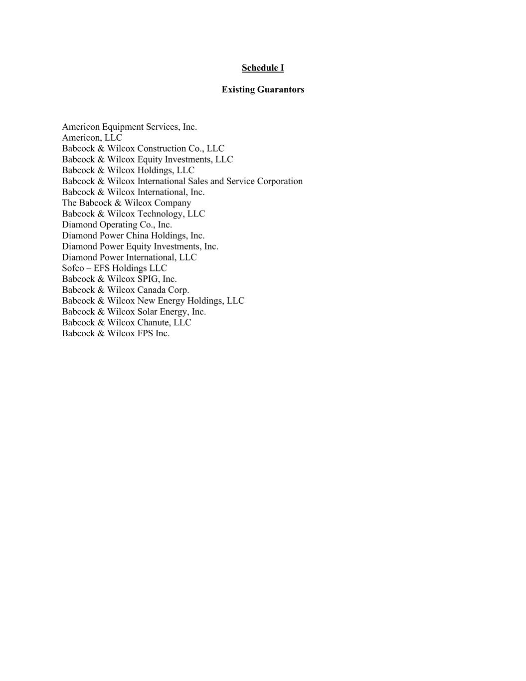 Schedule I Existing Guarantors Americon Equipment Services, Inc. Americon, LLC Babcock & Wilcox Construction Co., LLC Babcock & Wilcox Equity Investments, LLC Babcock & Wilcox Holdings, LLC Babcock & Wilcox International Sales and Service Corporation Babcock & Wilcox International, Inc. The Babcock & Wilcox Company Babcock & Wilcox Technology, LLC Diamond Operating Co., Inc. Diamond Power China Holdings, Inc. Diamond Power Equity Investments, Inc. Diamond Power International, LLC Sofco – EFS Holdings LLC Babcock & Wilcox SPIG, Inc. Babcock & Wilcox Canada Corp. Babcock & Wilcox New Energy Holdings, LLC Babcock & Wilcox Solar Energy, Inc. Babcock & Wilcox Chanute, LLC Babcock & Wilcox FPS Inc.