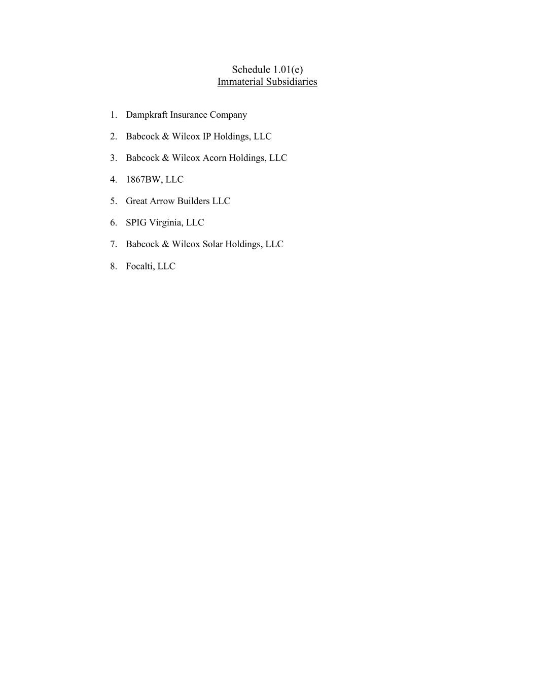 Schedule 1.01(e) Immaterial Subsidiaries 1. Dampkraft Insurance Company 2. Babcock & Wilcox IP Holdings, LLC 3. Babcock & Wilcox Acorn Holdings, LLC 4. 1867BW, LLC 5. Great Arrow Builders LLC 6. SPIG Virginia, LLC 7. Babcock & Wilcox Solar Holdings, LLC 8. Focalti, LLC