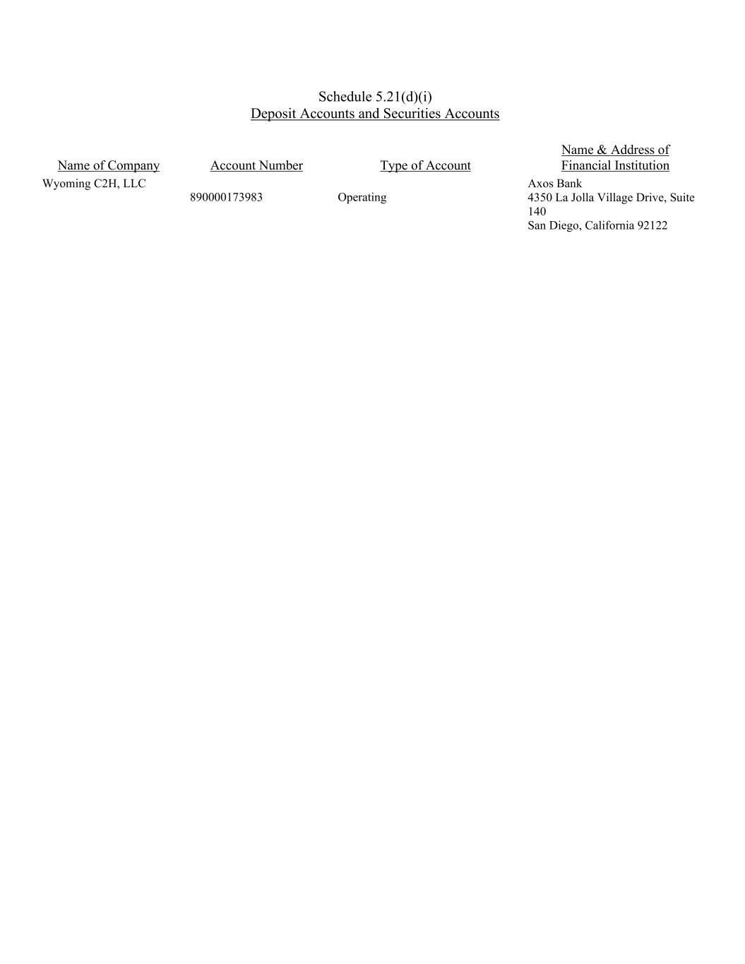 Schedule 5.21(d)(i) Deposit Accounts and Securities Accounts Name of Company Account Number Type of Account Name & Address of Financial Institution Wyoming C2H, LLC 890000173983 Operating Axos Bank 4350 La Jolla Village Drive, Suite 140 San Diego, California 92122