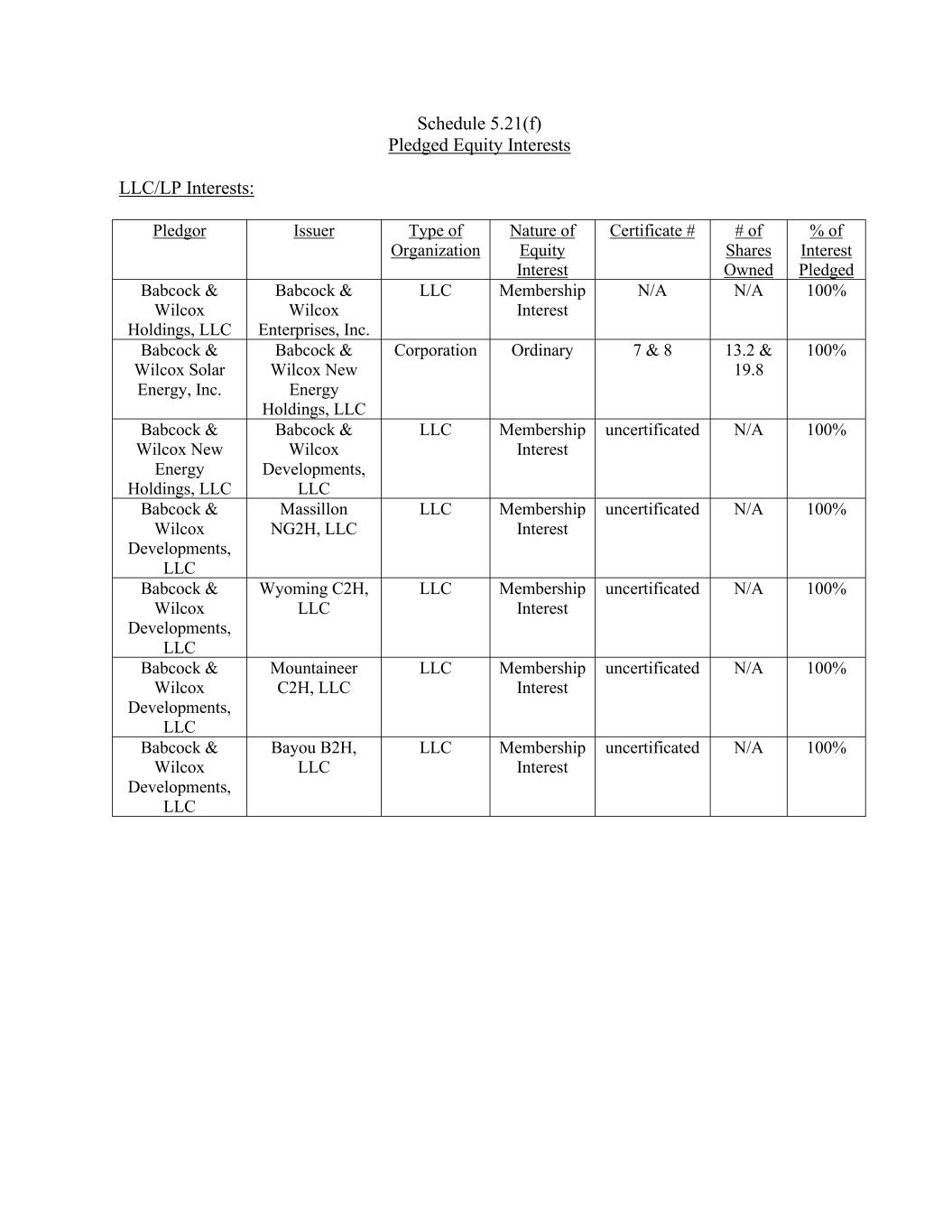 Schedule 5.21(f) Pledged Equity Interests LLC/LP Interests: Pledgor Issuer Type of Organization Nature of Equity Interest Certificate # # of Shares Owned % of Interest Pledged Babcock & Wilcox Holdings, LLC Babcock & Wilcox Enterprises, Inc. LLC Membership Interest N/A N/A 100% Babcock & Wilcox Solar Energy, Inc. Babcock & Wilcox New Energy Holdings, LLC Corporation Ordinary 7 & 8 13.2 & 19.8 100% Babcock & Wilcox New Energy Holdings, LLC Babcock & Wilcox Developments, LLC LLC Membership Interest uncertificated N/A 100% Babcock & Wilcox Developments, LLC Massillon NG2H, LLC LLC Membership Interest uncertificated N/A 100% Babcock & Wilcox Developments, LLC Wyoming C2H, LLC LLC Membership Interest uncertificated N/A 100% Babcock & Wilcox Developments, LLC Mountaineer C2H, LLC LLC Membership Interest uncertificated N/A 100% Babcock & Wilcox Developments, LLC Bayou B2H, LLC LLC Membership Interest uncertificated N/A 100%