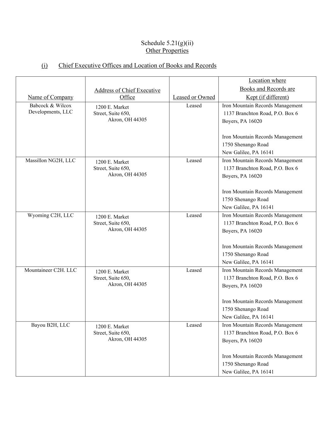Schedule 5.21(g)(ii) Other Properties (i) Chief Executive Offices and Location of Books and Records Name of Company Address of Chief Executive Office Leased or Owned Location where Books and Records are Kept (if different) Babcock & Wilcox Developments, LLC 1200 E. Market Street, Suite 650, Akron, OH 44305 Leased Iron Mountain Records Management 1137 Branchton Road, P.O. Box 6 Boyers, PA 16020 Iron Mountain Records Management 1750 Shenango Road New Galilee, PA 16141 Massillon NG2H, LLC 1200 E. Market Street, Suite 650, Akron, OH 44305 Leased Iron Mountain Records Management 1137 Branchton Road, P.O. Box 6 Boyers, PA 16020 Iron Mountain Records Management 1750 Shenango Road New Galilee, PA 16141 Wyoming C2H, LLC 1200 E. Market Street, Suite 650, Akron, OH 44305 Leased Iron Mountain Records Management 1137 Branchton Road, P.O. Box 6 Boyers, PA 16020 Iron Mountain Records Management 1750 Shenango Road New Galilee, PA 16141 Mountaineer C2H. LLC 1200 E. Market Street, Suite 650, Akron, OH 44305 Leased Iron Mountain Records Management 1137 Branchton Road, P.O. Box 6 Boyers, PA 16020 Iron Mountain Records Management 1750 Shenango Road New Galilee, PA 16141 Bayou B2H, LLC 1200 E. Market Street, Suite 650, Akron, OH 44305 Leased Iron Mountain Records Management 1137 Branchton Road, P.O. Box 6 Boyers, PA 16020 Iron Mountain Records Management 1750 Shenango Road New Galilee, PA 16141