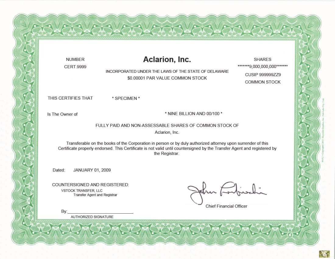 EX-4.1 2 aclarion_ex41.htm FORM OF COMMON STOCK CERTIFICATE aclarion_ex41.htm