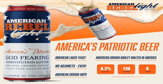 American Rebel Light Beer is a Premium Domestic Light Lager Beer that is “Better for You” – all-natural, crisp, clean, and bold with a lighter feel. Approximately 100 calories, 3.2 carbohydrates, and 4.3 percent ABV per 12 oz serving. Brewed without added supplements, corn, rice, or sweeteners.