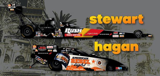 Primary looks: Stewart carries Rush Truck Centers on the Top Fuel Dragster; Hagan carries the orange, black, and white of American Rebel Beer on the Dodge//SRT Hellcat Funny Car.