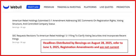American Rebel Holdings Clarifies: No Amended S-1 Filed on August 28; Webull/Benzinga Posts Mischaracterized Prior June 3 Filing