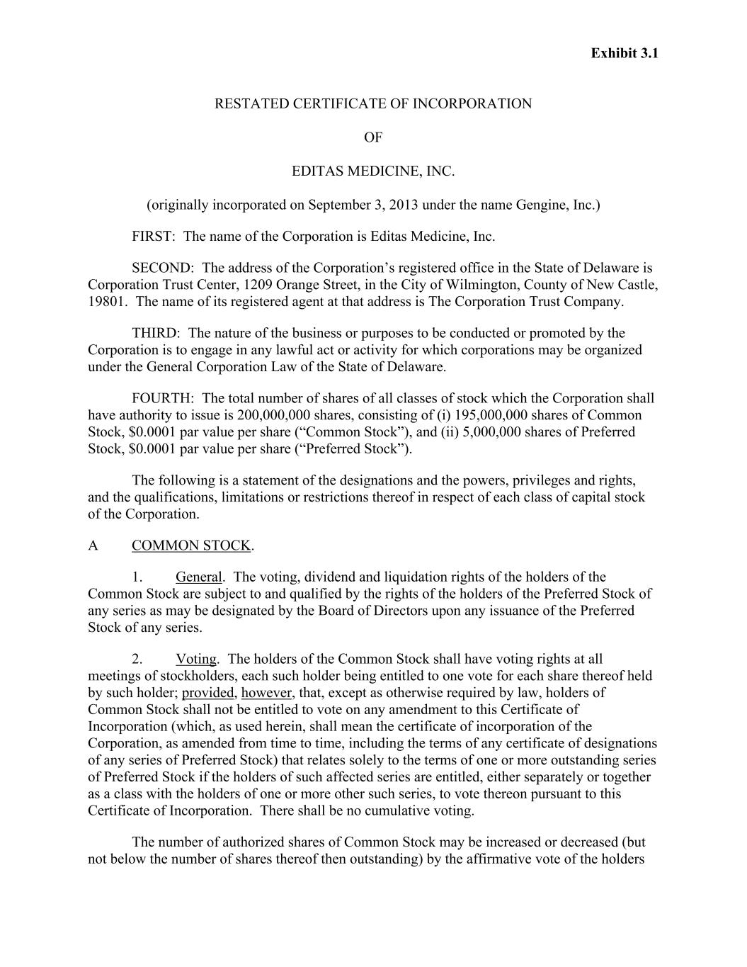 Exhibit 3.1 RESTATED CERTIFICATE OF INCORPORATION OF EDITAS MEDICINE, INC. (originally incorporated on September 3, 2013 under the name Gengine, Inc.) FIRST: The name of the Corporation is Editas Medicine, Inc. SECOND: The address of the Corporation’s registered office in the State of Delaware is Corporation Trust Center, 1209 Orange Street, in the City of Wilmington, County of New Castle, 19801. The name of its registered agent at that address is The Corporation Trust Company. THIRD: The nature of the business or purposes to be conducted or promoted by the Corporation is to engage in any lawful act or activity for which corporations may be organized under the General Corporation Law of the State of Delaware. FOURTH: The total number of shares of all classes of stock which the Corporation shall have authority to issue is 200,000,000 shares, consisting of (i) 195,000,000 shares of Common Stock, $0.0001 par value per share (“Common Stock”), and (ii) 5,000,000 shares of Preferred Stock, $0.0001 par value per share (“Preferred Stock”). The following is a statement of the designations and the powers, privileges and rights, and the qualifications, limitations or restrictions thereof in respect of each class of capital stock of the Corporation. A COMMON STOCK. 1. General. The voting, dividend and liquidation rights of the holders of the Common Stock are subject to and qualified by the rights of the holders of the Preferred Stock of any series as may be designated by the Board of Directors upon any issuance of the Preferred Stock of any series. 2. Voting. The holders of the Common Stock shall have voting rights at all meetings of stockholders, each such holder being entitled to one vote for each share thereof held by such holder; provided, however, that, except as otherwise required by law, holders of Common Stock shall not be entitled to vote on any amendment to this Certificate of Incorporation (which, as used herein, shall mean the certificate of incorporation of the Corporation, as amended from time to time, including the terms of any certificate of designations of any series of Preferred Stock) that relates solely to the terms of one or more outstanding series of Preferred Stock if the holders of such affected series are entitled, either separately or together as a class with the holders of one or more other such series, to vote thereon pursuant to this Certificate of Incorporation. There shall be no cumulative voting. The number of authorized shares of Common Stock may be increased or decreased (but not below the number of shares thereof then outstanding) by the affirmative vote of the holders