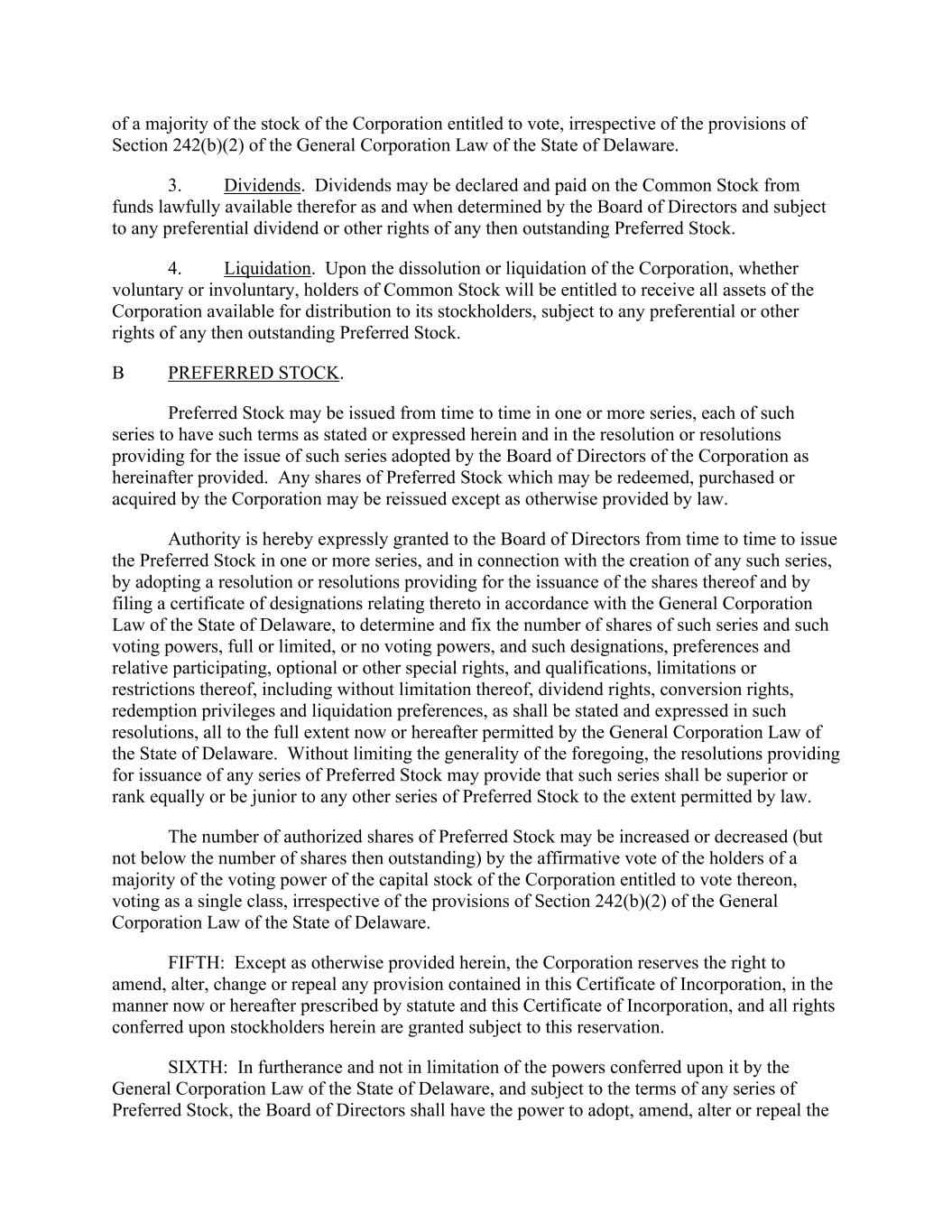 of a majority of the stock of the Corporation entitled to vote, irrespective of the provisions of Section 242(b)(2) of the General Corporation Law of the State of Delaware. 3. Dividends. Dividends may be declared and paid on the Common Stock from funds lawfully available therefor as and when determined by the Board of Directors and subject to any preferential dividend or other rights of any then outstanding Preferred Stock. 4. Liquidation. Upon the dissolution or liquidation of the Corporation, whether voluntary or involuntary, holders of Common Stock will be entitled to receive all assets of the Corporation available for distribution to its stockholders, subject to any preferential or other rights of any then outstanding Preferred Stock. B PREFERRED STOCK. Preferred Stock may be issued from time to time in one or more series, each of such series to have such terms as stated or expressed herein and in the resolution or resolutions providing for the issue of such series adopted by the Board of Directors of the Corporation as hereinafter provided. Any shares of Preferred Stock which may be redeemed, purchased or acquired by the Corporation may be reissued except as otherwise provided by law. Authority is hereby expressly granted to the Board of Directors from time to time to issue the Preferred Stock in one or more series, and in connection with the creation of any such series, by adopting a resolution or resolutions providing for the issuance of the shares thereof and by filing a certificate of designations relating thereto in accordance with the General Corporation Law of the State of Delaware, to determine and fix the number of shares of such series and such voting powers, full or limited, or no voting powers, and such designations, preferences and relative participating, optional or other special rights, and qualifications, limitations or restrictions thereof, including without limitation thereof, dividend rights, conversion rights, redemption privileges and liquidation preferences, as shall be stated and expressed in such resolutions, all to the full extent now or hereafter permitted by the General Corporation Law of the State of Delaware. Without limiting the generality of the foregoing, the resolutions providing for issuance of any series of Preferred Stock may provide that such series shall be superior or rank equally or be junior to any other series of Preferred Stock to the extent permitted by law. The number of authorized shares of Preferred Stock may be increased or decreased (but not below the number of shares then outstanding) by the affirmative vote of the holders of a majority of the voting power of the capital stock of the Corporation entitled to vote thereon, voting as a single class, irrespective of the provisions of Section 242(b)(2) of the General Corporation Law of the State of Delaware. FIFTH: Except as otherwise provided herein, the Corporation reserves the right to amend, alter, change or repeal any provision contained in this Certificate of Incorporation, in the manner now or hereafter prescribed by statute and this Certificate of Incorporation, and all rights conferred upon stockholders herein are granted subject to this reservation. SIXTH: In furtherance and not in limitation of the powers conferred upon it by the General Corporation Law of the State of Delaware, and subject to the terms of any series of Preferred Stock, the Board of Directors shall have the power to adopt, amend, alter or repeal the