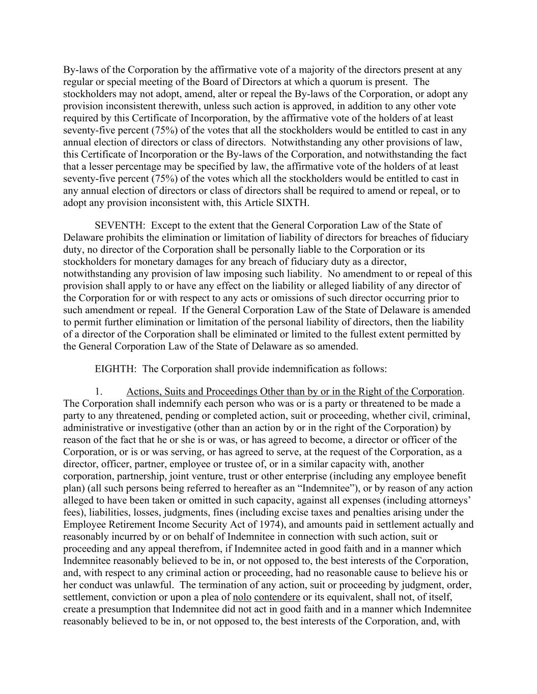 By-laws of the Corporation by the affirmative vote of a majority of the directors present at any regular or special meeting of the Board of Directors at which a quorum is present. The stockholders may not adopt, amend, alter or repeal the By-laws of the Corporation, or adopt any provision inconsistent therewith, unless such action is approved, in addition to any other vote required by this Certificate of Incorporation, by the affirmative vote of the holders of at least seventy-five percent (75%) of the votes that all the stockholders would be entitled to cast in any annual election of directors or class of directors. Notwithstanding any other provisions of law, this Certificate of Incorporation or the By-laws of the Corporation, and notwithstanding the fact that a lesser percentage may be specified by law, the affirmative vote of the holders of at least seventy-five percent (75%) of the votes which all the stockholders would be entitled to cast in any annual election of directors or class of directors shall be required to amend or repeal, or to adopt any provision inconsistent with, this Article SIXTH. SEVENTH: Except to the extent that the General Corporation Law of the State of Delaware prohibits the elimination or limitation of liability of directors for breaches of fiduciary duty, no director of the Corporation shall be personally liable to the Corporation or its stockholders for monetary damages for any breach of fiduciary duty as a director, notwithstanding any provision of law imposing such liability. No amendment to or repeal of this provision shall apply to or have any effect on the liability or alleged liability of any director of the Corporation for or with respect to any acts or omissions of such director occurring prior to such amendment or repeal. If the General Corporation Law of the State of Delaware is amended to permit further elimination or limitation of the personal liability of directors, then the liability of a director of the Corporation shall be eliminated or limited to the fullest extent permitted by the General Corporation Law of the State of Delaware as so amended. EIGHTH: The Corporation shall provide indemnification as follows: 1. Actions, Suits and Proceedings Other than by or in the Right of the Corporation. The Corporation shall indemnify each person who was or is a party or threatened to be made a party to any threatened, pending or completed action, suit or proceeding, whether civil, criminal, administrative or investigative (other than an action by or in the right of the Corporation) by reason of the fact that he or she is or was, or has agreed to become, a director or officer of the Corporation, or is or was serving, or has agreed to serve, at the request of the Corporation, as a director, officer, partner, employee or trustee of, or in a similar capacity with, another corporation, partnership, joint venture, trust or other enterprise (including any employee benefit plan) (all such persons being referred to hereafter as an “Indemnitee”), or by reason of any action alleged to have been taken or omitted in such capacity, against all expenses (including attorneys’ fees), liabilities, losses, judgments, fines (including excise taxes and penalties arising under the Employee Retirement Income Security Act of 1974), and amounts paid in settlement actually and reasonably incurred by or on behalf of Indemnitee in connection with such action, suit or proceeding and any appeal therefrom, if Indemnitee acted in good faith and in a manner which Indemnitee reasonably believed to be in, or not opposed to, the best interests of the Corporation, and, with respect to any criminal action or proceeding, had no reasonable cause to believe his or her conduct was unlawful. The termination of any action, suit or proceeding by judgment, order, settlement, conviction or upon a plea of nolo contendere or its equivalent, shall not, of itself, create a presumption that Indemnitee did not act in good faith and in a manner which Indemnitee reasonably believed to be in, or not opposed to, the best interests of the Corporation, and, with