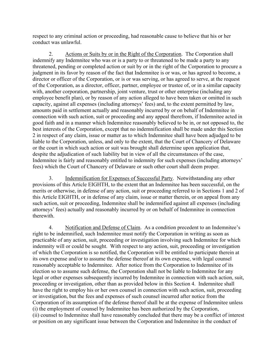respect to any criminal action or proceeding, had reasonable cause to believe that his or her conduct was unlawful. 2. Actions or Suits by or in the Right of the Corporation. The Corporation shall indemnify any Indemnitee who was or is a party to or threatened to be made a party to any threatened, pending or completed action or suit by or in the right of the Corporation to procure a judgment in its favor by reason of the fact that Indemnitee is or was, or has agreed to become, a director or officer of the Corporation, or is or was serving, or has agreed to serve, at the request of the Corporation, as a director, officer, partner, employee or trustee of, or in a similar capacity with, another corporation, partnership, joint venture, trust or other enterprise (including any employee benefit plan), or by reason of any action alleged to have been taken or omitted in such capacity, against all expenses (including attorneys’ fees) and, to the extent permitted by law, amounts paid in settlement actually and reasonably incurred by or on behalf of Indemnitee in connection with such action, suit or proceeding and any appeal therefrom, if Indemnitee acted in good faith and in a manner which Indemnitee reasonably believed to be in, or not opposed to, the best interests of the Corporation, except that no indemnification shall be made under this Section 2 in respect of any claim, issue or matter as to which Indemnitee shall have been adjudged to be liable to the Corporation, unless, and only to the extent, that the Court of Chancery of Delaware or the court in which such action or suit was brought shall determine upon application that, despite the adjudication of such liability but in view of all the circumstances of the case, Indemnitee is fairly and reasonably entitled to indemnity for such expenses (including attorneys’ fees) which the Court of Chancery of Delaware or such other court shall deem proper. 3. Indemnification for Expenses of Successful Party. Notwithstanding any other provisions of this Article EIGHTH, to the extent that an Indemnitee has been successful, on the merits or otherwise, in defense of any action, suit or proceeding referred to in Sections 1 and 2 of this Article EIGHTH, or in defense of any claim, issue or matter therein, or on appeal from any such action, suit or proceeding, Indemnitee shall be indemnified against all expenses (including attorneys’ fees) actually and reasonably incurred by or on behalf of Indemnitee in connection therewith. 4. Notification and Defense of Claim. As a condition precedent to an Indemnitee’s right to be indemnified, such Indemnitee must notify the Corporation in writing as soon as practicable of any action, suit, proceeding or investigation involving such Indemnitee for which indemnity will or could be sought. With respect to any action, suit, proceeding or investigation of which the Corporation is so notified, the Corporation will be entitled to participate therein at its own expense and/or to assume the defense thereof at its own expense, with legal counsel reasonably acceptable to Indemnitee. After notice from the Corporation to Indemnitee of its election so to assume such defense, the Corporation shall not be liable to Indemnitee for any legal or other expenses subsequently incurred by Indemnitee in connection with such action, suit, proceeding or investigation, other than as provided below in this Section 4. Indemnitee shall have the right to employ his or her own counsel in connection with such action, suit, proceeding or investigation, but the fees and expenses of such counsel incurred after notice from the Corporation of its assumption of the defense thereof shall be at the expense of Indemnitee unless (i) the employment of counsel by Indemnitee has been authorized by the Corporation, (ii) counsel to Indemnitee shall have reasonably concluded that there may be a conflict of interest or position on any significant issue between the Corporation and Indemnitee in the conduct of