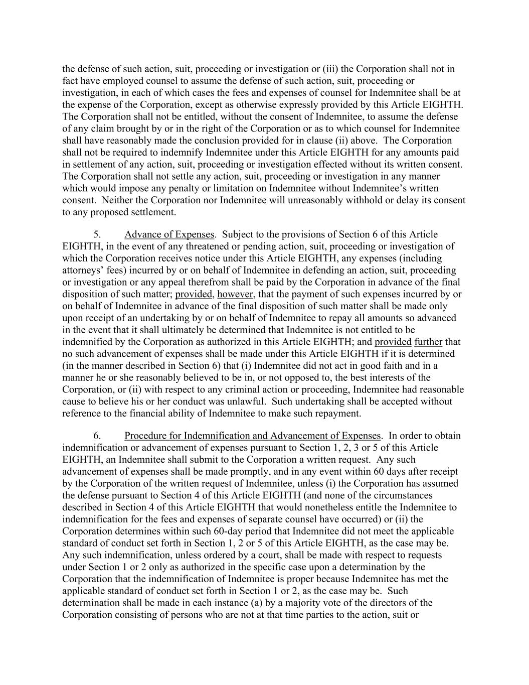 the defense of such action, suit, proceeding or investigation or (iii) the Corporation shall not in fact have employed counsel to assume the defense of such action, suit, proceeding or investigation, in each of which cases the fees and expenses of counsel for Indemnitee shall be at the expense of the Corporation, except as otherwise expressly provided by this Article EIGHTH. The Corporation shall not be entitled, without the consent of Indemnitee, to assume the defense of any claim brought by or in the right of the Corporation or as to which counsel for Indemnitee shall have reasonably made the conclusion provided for in clause (ii) above. The Corporation shall not be required to indemnify Indemnitee under this Article EIGHTH for any amounts paid in settlement of any action, suit, proceeding or investigation effected without its written consent. The Corporation shall not settle any action, suit, proceeding or investigation in any manner which would impose any penalty or limitation on Indemnitee without Indemnitee’s written consent. Neither the Corporation nor Indemnitee will unreasonably withhold or delay its consent to any proposed settlement. 5. Advance of Expenses. Subject to the provisions of Section 6 of this Article EIGHTH, in the event of any threatened or pending action, suit, proceeding or investigation of which the Corporation receives notice under this Article EIGHTH, any expenses (including attorneys’ fees) incurred by or on behalf of Indemnitee in defending an action, suit, proceeding or investigation or any appeal therefrom shall be paid by the Corporation in advance of the final disposition of such matter; provided, however, that the payment of such expenses incurred by or on behalf of Indemnitee in advance of the final disposition of such matter shall be made only upon receipt of an undertaking by or on behalf of Indemnitee to repay all amounts so advanced in the event that it shall ultimately be determined that Indemnitee is not entitled to be indemnified by the Corporation as authorized in this Article EIGHTH; and provided further that no such advancement of expenses shall be made under this Article EIGHTH if it is determined (in the manner described in Section 6) that (i) Indemnitee did not act in good faith and in a manner he or she reasonably believed to be in, or not opposed to, the best interests of the Corporation, or (ii) with respect to any criminal action or proceeding, Indemnitee had reasonable cause to believe his or her conduct was unlawful. Such undertaking shall be accepted without reference to the financial ability of Indemnitee to make such repayment. 6. Procedure for Indemnification and Advancement of Expenses. In order to obtain indemnification or advancement of expenses pursuant to Section 1, 2, 3 or 5 of this Article EIGHTH, an Indemnitee shall submit to the Corporation a written request. Any such advancement of expenses shall be made promptly, and in any event within 60 days after receipt by the Corporation of the written request of Indemnitee, unless (i) the Corporation has assumed the defense pursuant to Section 4 of this Article EIGHTH (and none of the circumstances described in Section 4 of this Article EIGHTH that would nonetheless entitle the Indemnitee to indemnification for the fees and expenses of separate counsel have occurred) or (ii) the Corporation determines within such 60-day period that Indemnitee did not meet the applicable standard of conduct set forth in Section 1, 2 or 5 of this Article EIGHTH, as the case may be. Any such indemnification, unless ordered by a court, shall be made with respect to requests under Section 1 or 2 only as authorized in the specific case upon a determination by the Corporation that the indemnification of Indemnitee is proper because Indemnitee has met the applicable standard of conduct set forth in Section 1 or 2, as the case may be. Such determination shall be made in each instance (a) by a majority vote of the directors of the Corporation consisting of persons who are not at that time parties to the action, suit or