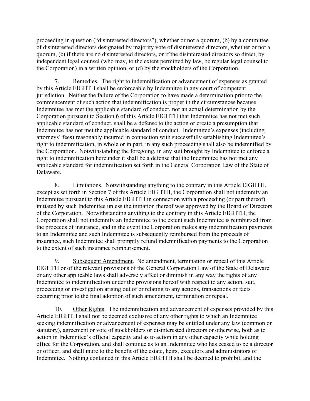 proceeding in question (“disinterested directors”), whether or not a quorum, (b) by a committee of disinterested directors designated by majority vote of disinterested directors, whether or not a quorum, (c) if there are no disinterested directors, or if the disinterested directors so direct, by independent legal counsel (who may, to the extent permitted by law, be regular legal counsel to the Corporation) in a written opinion, or (d) by the stockholders of the Corporation. 7. Remedies. The right to indemnification or advancement of expenses as granted by this Article EIGHTH shall be enforceable by Indemnitee in any court of competent jurisdiction. Neither the failure of the Corporation to have made a determination prior to the commencement of such action that indemnification is proper in the circumstances because Indemnitee has met the applicable standard of conduct, nor an actual determination by the Corporation pursuant to Section 6 of this Article EIGHTH that Indemnitee has not met such applicable standard of conduct, shall be a defense to the action or create a presumption that Indemnitee has not met the applicable standard of conduct. Indemnitee’s expenses (including attorneys’ fees) reasonably incurred in connection with successfully establishing Indemnitee’s right to indemnification, in whole or in part, in any such proceeding shall also be indemnified by the Corporation. Notwithstanding the foregoing, in any suit brought by Indemnitee to enforce a right to indemnification hereunder it shall be a defense that the Indemnitee has not met any applicable standard for indemnification set forth in the General Corporation Law of the State of Delaware. 8. Limitations. Notwithstanding anything to the contrary in this Article EIGHTH, except as set forth in Section 7 of this Article EIGHTH, the Corporation shall not indemnify an Indemnitee pursuant to this Article EIGHTH in connection with a proceeding (or part thereof) initiated by such Indemnitee unless the initiation thereof was approved by the Board of Directors of the Corporation. Notwithstanding anything to the contrary in this Article EIGHTH, the Corporation shall not indemnify an Indemnitee to the extent such Indemnitee is reimbursed from the proceeds of insurance, and in the event the Corporation makes any indemnification payments to an Indemnitee and such Indemnitee is subsequently reimbursed from the proceeds of insurance, such Indemnitee shall promptly refund indemnification payments to the Corporation to the extent of such insurance reimbursement. 9. Subsequent Amendment. No amendment, termination or repeal of this Article EIGHTH or of the relevant provisions of the General Corporation Law of the State of Delaware or any other applicable laws shall adversely affect or diminish in any way the rights of any Indemnitee to indemnification under the provisions hereof with respect to any action, suit, proceeding or investigation arising out of or relating to any actions, transactions or facts occurring prior to the final adoption of such amendment, termination or repeal. 10. Other Rights. The indemnification and advancement of expenses provided by this Article EIGHTH shall not be deemed exclusive of any other rights to which an Indemnitee seeking indemnification or advancement of expenses may be entitled under any law (common or statutory), agreement or vote of stockholders or disinterested directors or otherwise, both as to action in Indemnitee’s official capacity and as to action in any other capacity while holding office for the Corporation, and shall continue as to an Indemnitee who has ceased to be a director or officer, and shall inure to the benefit of the estate, heirs, executors and administrators of Indemnitee. Nothing contained in this Article EIGHTH shall be deemed to prohibit, and the