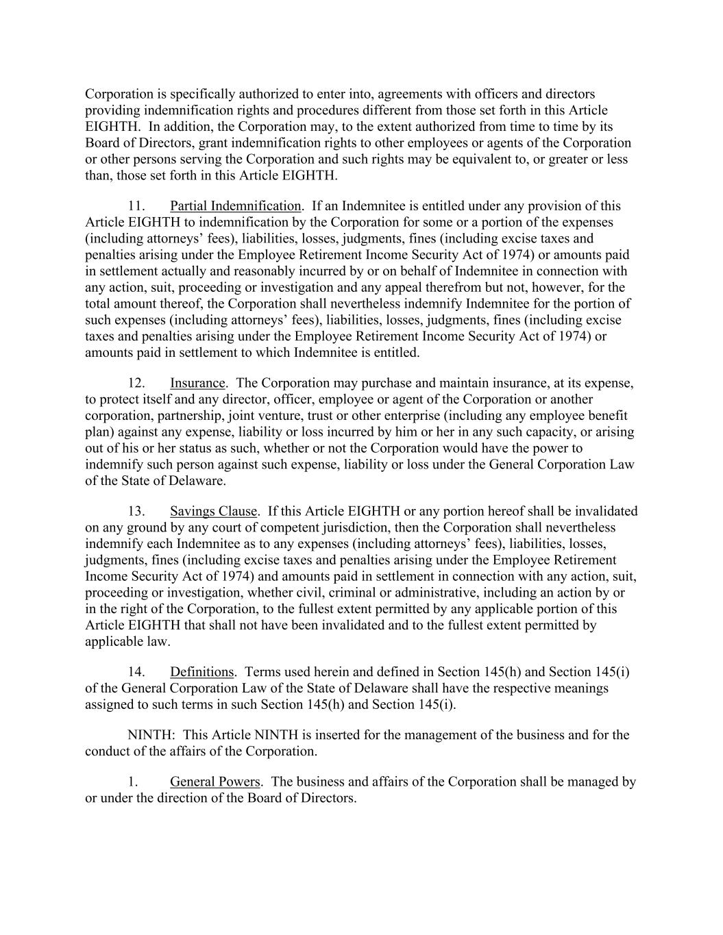 Corporation is specifically authorized to enter into, agreements with officers and directors providing indemnification rights and procedures different from those set forth in this Article EIGHTH. In addition, the Corporation may, to the extent authorized from time to time by its Board of Directors, grant indemnification rights to other employees or agents of the Corporation or other persons serving the Corporation and such rights may be equivalent to, or greater or less than, those set forth in this Article EIGHTH. 11. Partial Indemnification. If an Indemnitee is entitled under any provision of this Article EIGHTH to indemnification by the Corporation for some or a portion of the expenses (including attorneys’ fees), liabilities, losses, judgments, fines (including excise taxes and penalties arising under the Employee Retirement Income Security Act of 1974) or amounts paid in settlement actually and reasonably incurred by or on behalf of Indemnitee in connection with any action, suit, proceeding or investigation and any appeal therefrom but not, however, for the total amount thereof, the Corporation shall nevertheless indemnify Indemnitee for the portion of such expenses (including attorneys’ fees), liabilities, losses, judgments, fines (including excise taxes and penalties arising under the Employee Retirement Income Security Act of 1974) or amounts paid in settlement to which Indemnitee is entitled. 12. Insurance. The Corporation may purchase and maintain insurance, at its expense, to protect itself and any director, officer, employee or agent of the Corporation or another corporation, partnership, joint venture, trust or other enterprise (including any employee benefit plan) against any expense, liability or loss incurred by him or her in any such capacity, or arising out of his or her status as such, whether or not the Corporation would have the power to indemnify such person against such expense, liability or loss under the General Corporation Law of the State of Delaware. 13. Savings Clause. If this Article EIGHTH or any portion hereof shall be invalidated on any ground by any court of competent jurisdiction, then the Corporation shall nevertheless indemnify each Indemnitee as to any expenses (including attorneys’ fees), liabilities, losses, judgments, fines (including excise taxes and penalties arising under the Employee Retirement Income Security Act of 1974) and amounts paid in settlement in connection with any action, suit, proceeding or investigation, whether civil, criminal or administrative, including an action by or in the right of the Corporation, to the fullest extent permitted by any applicable portion of this Article EIGHTH that shall not have been invalidated and to the fullest extent permitted by applicable law. 14. Definitions. Terms used herein and defined in Section 145(h) and Section 145(i) of the General Corporation Law of the State of Delaware shall have the respective meanings assigned to such terms in such Section 145(h) and Section 145(i). NINTH: This Article NINTH is inserted for the management of the business and for the conduct of the affairs of the Corporation. 1. General Powers. The business and affairs of the Corporation shall be managed by or under the direction of the Board of Directors.