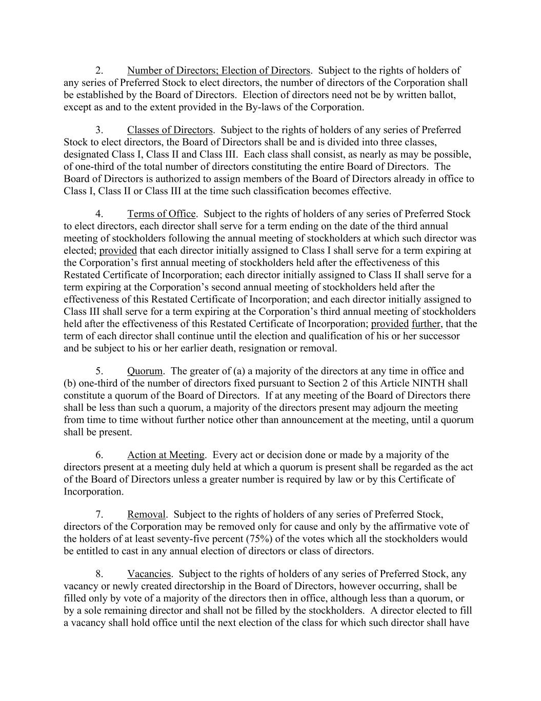 2. Number of Directors; Election of Directors. Subject to the rights of holders of any series of Preferred Stock to elect directors, the number of directors of the Corporation shall be established by the Board of Directors. Election of directors need not be by written ballot, except as and to the extent provided in the By-laws of the Corporation. 3. Classes of Directors. Subject to the rights of holders of any series of Preferred Stock to elect directors, the Board of Directors shall be and is divided into three classes, designated Class I, Class II and Class III. Each class shall consist, as nearly as may be possible, of one-third of the total number of directors constituting the entire Board of Directors. The Board of Directors is authorized to assign members of the Board of Directors already in office to Class I, Class II or Class III at the time such classification becomes effective. 4. Terms of Office. Subject to the rights of holders of any series of Preferred Stock to elect directors, each director shall serve for a term ending on the date of the third annual meeting of stockholders following the annual meeting of stockholders at which such director was elected; provided that each director initially assigned to Class I shall serve for a term expiring at the Corporation’s first annual meeting of stockholders held after the effectiveness of this Restated Certificate of Incorporation; each director initially assigned to Class II shall serve for a term expiring at the Corporation’s second annual meeting of stockholders held after the effectiveness of this Restated Certificate of Incorporation; and each director initially assigned to Class III shall serve for a term expiring at the Corporation’s third annual meeting of stockholders held after the effectiveness of this Restated Certificate of Incorporation; provided further, that the term of each director shall continue until the election and qualification of his or her successor and be subject to his or her earlier death, resignation or removal. 5. Quorum. The greater of (a) a majority of the directors at any time in office and (b) one-third of the number of directors fixed pursuant to Section 2 of this Article NINTH shall constitute a quorum of the Board of Directors. If at any meeting of the Board of Directors there shall be less than such a quorum, a majority of the directors present may adjourn the meeting from time to time without further notice other than announcement at the meeting, until a quorum shall be present. 6. Action at Meeting. Every act or decision done or made by a majority of the directors present at a meeting duly held at which a quorum is present shall be regarded as the act of the Board of Directors unless a greater number is required by law or by this Certificate of Incorporation. 7. Removal. Subject to the rights of holders of any series of Preferred Stock, directors of the Corporation may be removed only for cause and only by the affirmative vote of the holders of at least seventy-five percent (75%) of the votes which all the stockholders would be entitled to cast in any annual election of directors or class of directors. 8. Vacancies. Subject to the rights of holders of any series of Preferred Stock, any vacancy or newly created directorship in the Board of Directors, however occurring, shall be filled only by vote of a majority of the directors then in office, although less than a quorum, or by a sole remaining director and shall not be filled by the stockholders. A director elected to fill a vacancy shall hold office until the next election of the class for which such director shall have