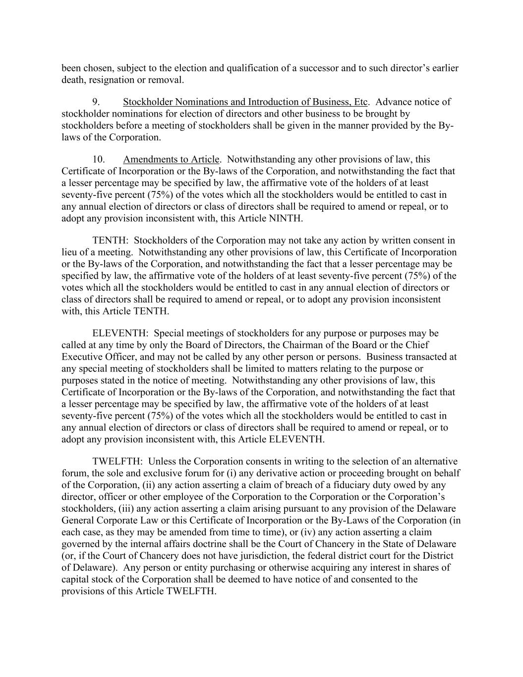 been chosen, subject to the election and qualification of a successor and to such director’s earlier death, resignation or removal. 9. Stockholder Nominations and Introduction of Business, Etc. Advance notice of stockholder nominations for election of directors and other business to be brought by stockholders before a meeting of stockholders shall be given in the manner provided by the By- laws of the Corporation. 10. Amendments to Article. Notwithstanding any other provisions of law, this Certificate of Incorporation or the By-laws of the Corporation, and notwithstanding the fact that a lesser percentage may be specified by law, the affirmative vote of the holders of at least seventy-five percent (75%) of the votes which all the stockholders would be entitled to cast in any annual election of directors or class of directors shall be required to amend or repeal, or to adopt any provision inconsistent with, this Article NINTH. TENTH: Stockholders of the Corporation may not take any action by written consent in lieu of a meeting. Notwithstanding any other provisions of law, this Certificate of Incorporation or the By-laws of the Corporation, and notwithstanding the fact that a lesser percentage may be specified by law, the affirmative vote of the holders of at least seventy-five percent (75%) of the votes which all the stockholders would be entitled to cast in any annual election of directors or class of directors shall be required to amend or repeal, or to adopt any provision inconsistent with, this Article TENTH. ELEVENTH: Special meetings of stockholders for any purpose or purposes may be called at any time by only the Board of Directors, the Chairman of the Board or the Chief Executive Officer, and may not be called by any other person or persons. Business transacted at any special meeting of stockholders shall be limited to matters relating to the purpose or purposes stated in the notice of meeting. Notwithstanding any other provisions of law, this Certificate of Incorporation or the By-laws of the Corporation, and notwithstanding the fact that a lesser percentage may be specified by law, the affirmative vote of the holders of at least seventy-five percent (75%) of the votes which all the stockholders would be entitled to cast in any annual election of directors or class of directors shall be required to amend or repeal, or to adopt any provision inconsistent with, this Article ELEVENTH. TWELFTH: Unless the Corporation consents in writing to the selection of an alternative forum, the sole and exclusive forum for (i) any derivative action or proceeding brought on behalf of the Corporation, (ii) any action asserting a claim of breach of a fiduciary duty owed by any director, officer or other employee of the Corporation to the Corporation or the Corporation’s stockholders, (iii) any action asserting a claim arising pursuant to any provision of the Delaware General Corporate Law or this Certificate of Incorporation or the By-Laws of the Corporation (in each case, as they may be amended from time to time), or (iv) any action asserting a claim governed by the internal affairs doctrine shall be the Court of Chancery in the State of Delaware (or, if the Court of Chancery does not have jurisdiction, the federal district court for the District of Delaware). Any person or entity purchasing or otherwise acquiring any interest in shares of capital stock of the Corporation shall be deemed to have notice of and consented to the provisions of this Article TWELFTH.