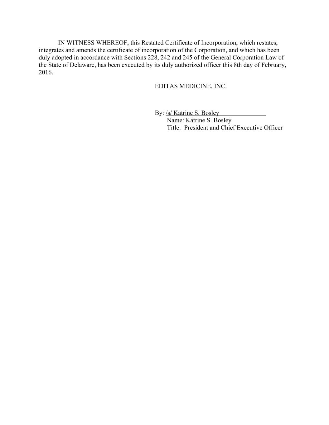 IN WITNESS WHEREOF, this Restated Certificate of Incorporation, which restates, integrates and amends the certificate of incorporation of the Corporation, and which has been duly adopted in accordance with Sections 228, 242 and 245 of the General Corporation Law of the State of Delaware, has been executed by its duly authorized officer this 8th day of February, 2016. EDITAS MEDICINE, INC. By: /s/ Katrine S. Bosley Name: Katrine S. Bosley Title: President and Chief Executive Officer