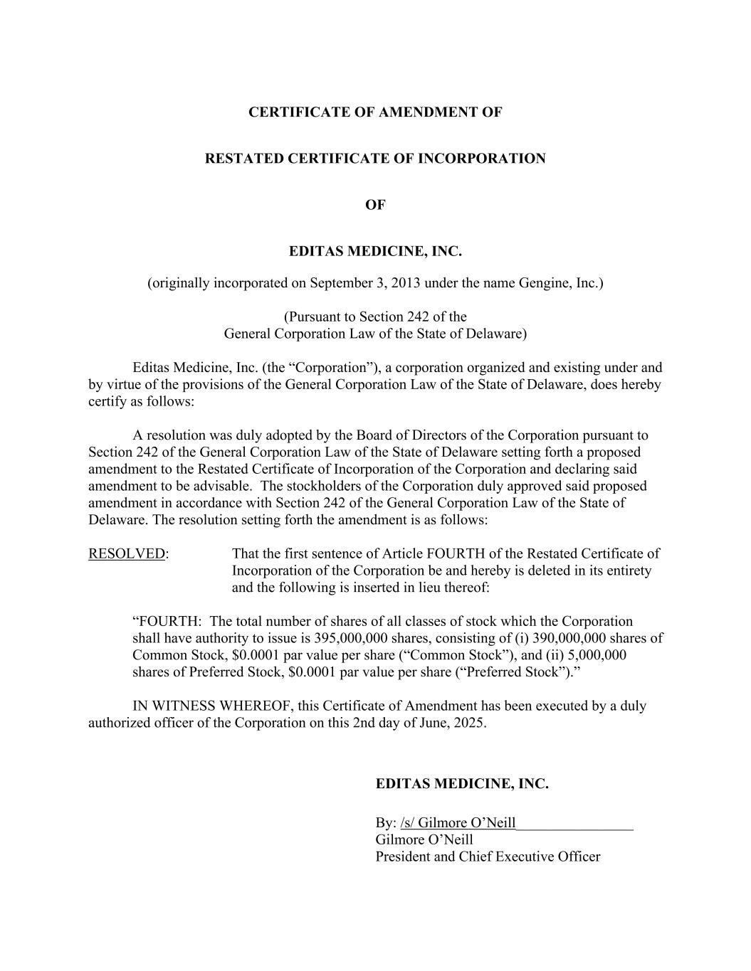 CERTIFICATE OF AMENDMENT OF RESTATED CERTIFICATE OF INCORPORATION OF EDITAS MEDICINE, INC. (originally incorporated on September 3, 2013 under the name Gengine, Inc.) (Pursuant to Section 242 of the General Corporation Law of the State of Delaware) Editas Medicine, Inc. (the “Corporation”), a corporation organized and existing under and by virtue of the provisions of the General Corporation Law of the State of Delaware, does hereby certify as follows: A resolution was duly adopted by the Board of Directors of the Corporation pursuant to Section 242 of the General Corporation Law of the State of Delaware setting forth a proposed amendment to the Restated Certificate of Incorporation of the Corporation and declaring said amendment to be advisable. The stockholders of the Corporation duly approved said proposed amendment in accordance with Section 242 of the General Corporation Law of the State of Delaware. The resolution setting forth the amendment is as follows: RESOLVED: That the first sentence of Article FOURTH of the Restated Certificate of Incorporation of the Corporation be and hereby is deleted in its entirety and the following is inserted in lieu thereof: “FOURTH: The total number of shares of all classes of stock which the Corporation shall have authority to issue is 395,000,000 shares, consisting of (i) 390,000,000 shares of Common Stock, $0.0001 par value per share (“Common Stock”), and (ii) 5,000,000 shares of Preferred Stock, $0.0001 par value per share (“Preferred Stock”).” IN WITNESS WHEREOF, this Certificate of Amendment has been executed by a duly authorized officer of the Corporation on this 2nd day of June, 2025. EDITAS MEDICINE, INC. By: /s/ Gilmore O’Neill________________ Gilmore O’Neill President and Chief Executive Officer