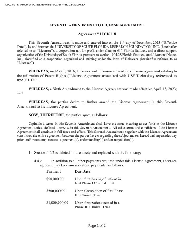 Page 1 of 2 SEVENTH AMENDMENT TO LICENSE AGREEMENT Agreement # LIC16118 This Seventh Amendment, is made and entered into on the 11th day of December, 2023 ("Effective Date"), by and between the UNIVERSITY OF SOUTH FLORIDA RESEARCH FOUNDATION, INC. (hereinafter referred to as "Licensor"), a corporation not for profit under Chapter 617 Florida Statutes, and a direct support organization of the University of South Florida pursuant to section 1004.28 Florida Statutes, and Alzamend Neuro, Inc., classified as a corporation organized and existing under the laws of Delaware (hereinafter referred to as "Licensee"). WHEREAS, on May 1, 2016, Licensor and Licensee entered in a license agreement relating to the utilization of Patent Rights ("License Agreement associated with USF Technology referenced as 09A021_Cao; WHEREAS, a Sixth Amendment to the License Agreement was made effective April 17, 2023; and WHEREAS, the parties desire to further amend the License Agreement in this Seventh Amendment to the License Agreement. NOW, THEREFORE, the parties agree as follows: Capitalized terms in this Seventh Amendment shall have the same meaning as set forth in the License Agreement, unless defined otherwise in this Seventh Amendment. All other terms and conditions of the License Agreement shall continue in full force and effect. This Seventh Amendment, together with the License Agreement constitutes the entire agreement between the parties hereto regarding the subject matter hereof and supersedes any prior and/or contemporaneous agreement(s), understanding(s) and/or negotiation(s). 1. Section 4.4.2 is deleted in its entirety and replaced with the following: 4.4.2 In addition to all other payments required under this License Agreement, Licensee agrees to pay Licensor milestone payments, as follows: Payment Due Date $50,000.00 Upon first dosing of patient in first Phase I Clinical Trial $500,000.00 $1,000,000.00 Upon Completion of first Phase IIb Clinical Trial Upon first patient treated in a Phase III Clinical Trial