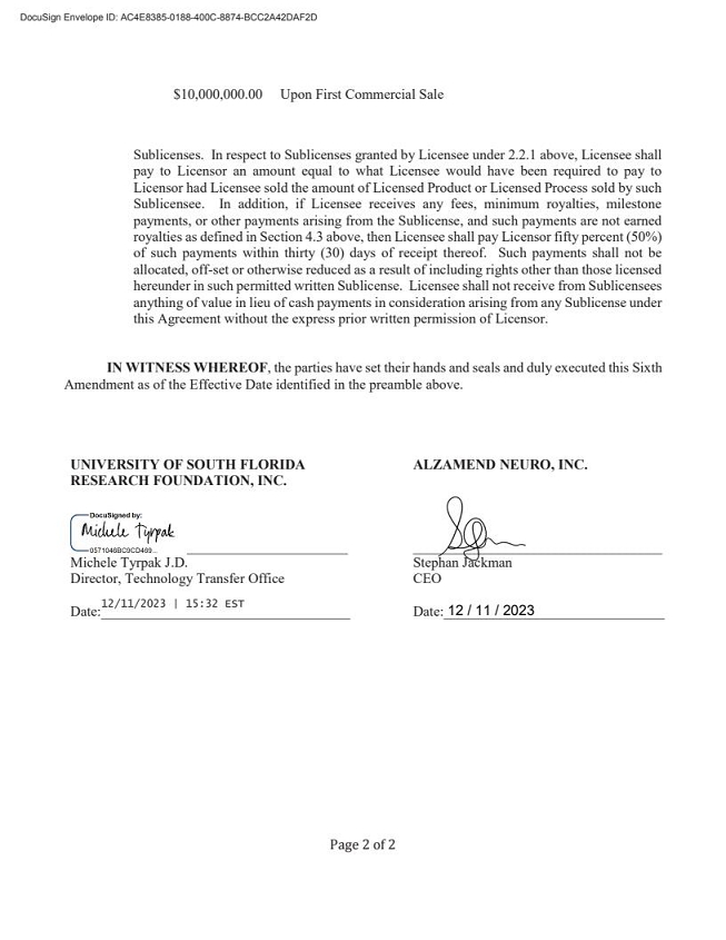 Page 2 of 2 Sublicenses. In respect to Sublicenses granted by Licensee under 2.2.1 above, Licensee shall pay to Licensor an amount equal to what Licensee would have been required to pay to Licensor had Licensee sold the amount of Licensed Product or Licensed Process sold by such Sublicensee. In addition, if Licensee receives any fees, minimum royalties, milestone payments, or other payments arising from the Sublicense, and such payments are not earned royalties as defined in Section 4.3 above, then Licensee shall pay Licensor fifty percent (50%) of such payments within thirty (30) days of receipt thereof. Such payments shall not be allocated, off-set or otherwise reduced as a result of including rights other than those licensed hereunder in such permitted written Sublicense. Licensee shall not receive from Sublicensees anything of value in lieu of cash payments in consideration arising from any Sublicense under this Agreement without the express prior written permission of Licensor. IN WITNESS WHEREOF, the parties have set their hands and seals and duly executed this Sixth Amendment as of the Effective Date identified in the preamble above. $10,000,000.00 Upon First Commercial Sale UNIVERSITY OF SOUTH FLORIDA RESEARCH FOUNDATION, INC. ALZAMEND NEURO, INC. _______________________________________ ___________________________________ Michele Tyrpak J.D. Stephan Jackman Director, Technology Transfer Office CEO Date:___________________________________ Date:_______________________________ 12 / 11 / 2023