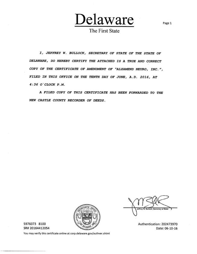 Delaware Page 1 The First State I, JEFFREY W. BULLOCK, SECRETARY OF STATE OF THE STATE OF DELAWARE, DO HEREBY CERTIFY THE ATTACHED IS A TRUE AND CORRECT COPY OF THE CERTIFICATE OF AMENDMENT OF "ALZAMEND NEURO, INC. ", FILED IN THIS OFFICE ON THE TENTH DAY OF JUNE, A. D. 2016, AT 4:36 O'CLOCK P.M. A FILED COPY OF THIS CERTIFICATE HAS BEEN FORWARDED TO THE NEW CASTLE COUNTY RECORDER OF DEEDS. 5976073 8100 SR# 20164412054 You may verify this certificate online at corp.delaware.gov/authver.shtml Authentication: 2024 73970 Date: 06-10-16