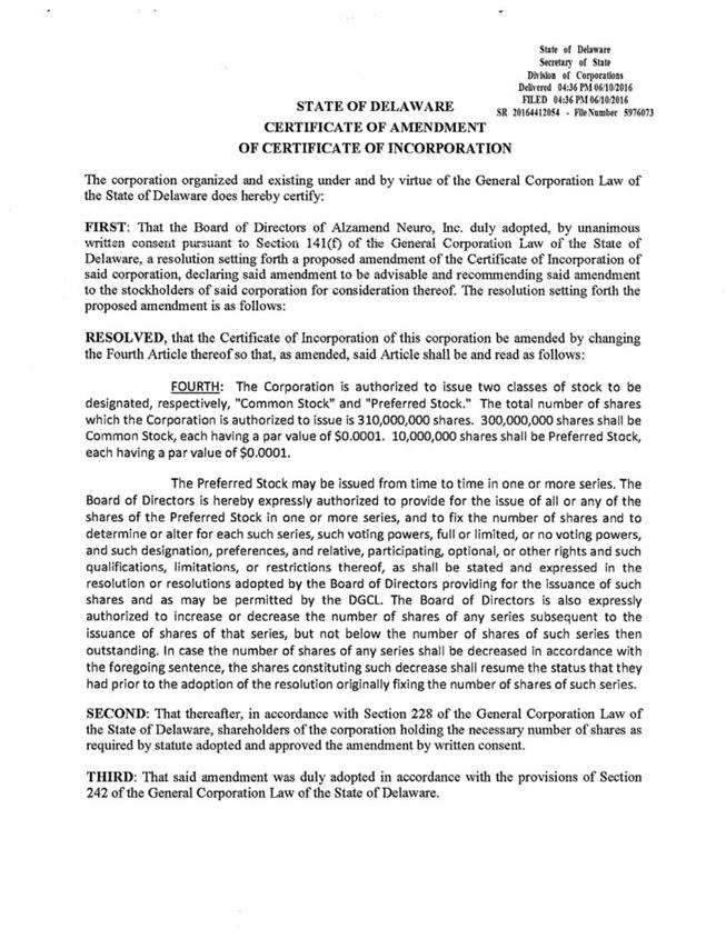 State of Delaware Secretary of State DMslon of Corporations . Deli"ered 04:36 PM 06/1012016 FILED 04:36 PM 06/1012016 STATE OF DELA\VARE CERTIFICATE OF AMENDMENT SR 20164412054 ? File~umber 5976073 OF CERTIFICATE OF INCORPORATION The corporation organized and existing m1der and by virtue of the General Corporation Law of the State of Delaware does hereby certify: FIRST: That the Board of Directors of Alza,mend Neuro, Inc. duly adopted, by unanimous vlritten consent pursuant to Sectio11 l41{f) of the General Corporation Law of the State of Delaivare, a resolution setting forth a proposed amendment of the Certificate of Incorporation of said corporation, declaring said amendment to be advisable and recommending said amendment to the stockholders of said corporation for consideration thereof. The resolution setting forth the proposed amendment is as follows: RESOLVED, that the Certificate of Incorporation of this corporation be amended by changing the Fourth Article thereof so that, as amended, said Article shall be and read as follows: FOURTH: The Corporation is authorized to issue two classes of stock to be designated, respectively, "Common Stock" and "Preferred Stock." The total number of shares which the Corporation is authorized to issue is 310,000,000 shares. 300,000,000 shares shall be Common Stock, each having a par value of $0.0001. 10,000,000 shares shall be Preferred Stock, each having a par value of $0,0001. The Preferred Stock may be issued from time to time in one or more series. The Board of Directors is hereby expressly authorized to provide for the issue of all or any of the shares of the Preferred Stock in one or more series, and to fix the number of shares and to det2rmine or alter for each such series, such voting powers, full or limited, or no voting powers, a.nd such designation, preferences, and relative, participating, optional, or other rights and such qualifications, limitations, or restrictions thereof, as shall be stated and expressed in the resolution or resolutions adopted by the Board of Directors providing for the issuance of such shares and as may be permitted by the DGCL. The Board of Directors is also expressly authorized to increase or decrease the number of shares of any series subsequent to the issuance of shares of that series, but not below the number of shares of such series then outstanding. In case the number of shares of any series shall be decreased in accordance with the foregoing sentence, the shares constituting such decrease shall resume the status that they had prior to the adoption of the resolution originally fixing the number of shares of such series. SECOND: That thereafter, in accordance with Section 228 of the General Corporation Law of the State of Delaware, shareholders of the corporation holding the necessary number of shares as required by statute adopted and approved the amendment by written consent. THIRD: That said amendment was duly adopted in accordance with the provisions of Section 242 of the General Corporation Law of the State of Delaware.