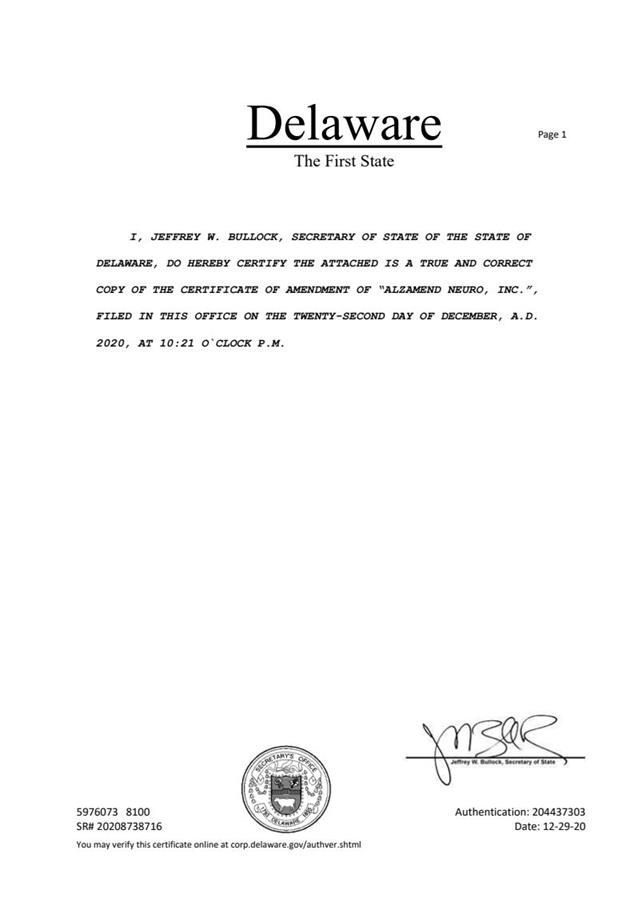 DelawareThe First StatePage 1 5976073 8100Authentication: 204437303SR# 20208738716Date: 12-29-20You may verify this certificate online at corp.delaware.gov/authver.shtmlI, JEFFREY W. BULLOCK, SECRETARY OF STATE OF THE STATE OF DELAWARE, DO HEREBY CERTIFY THE ATTACHED IS A TRUE AND CORRECT COPY OF THE CERTIFICATE OF AMENDMENT OF "ALZAMEND NEURO, INC.", FILED IN THIS OFFICE ON THE TWENTY-SECOND DAY OF DECEMBER, A.D. 2020, AT 10:21 O`CLOCK P.M.