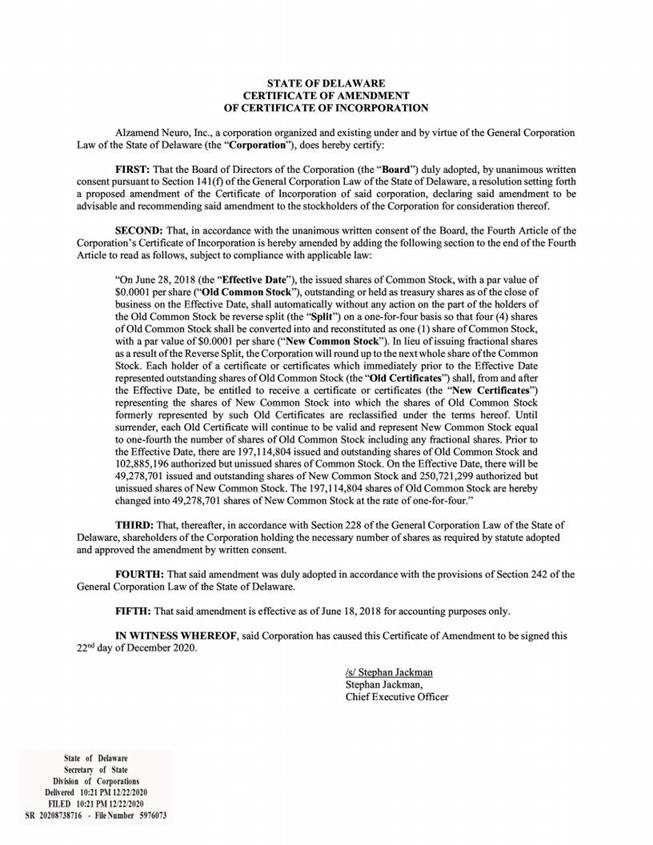 STATE OF DELAWARE CERTIFICATE OF AMENDMENT OF CERTIFICATE OF INCORPORATION Alzamend Neuro, Inc., a corporation organized and existing under and by virtue of the General Corporation Law of the State of Delaware (the "Corporation"), does hereby certify: FIRST: That the Board of Directors of the Corporation (the "Board") duly adopted, by unanimous written consent pursuant to Section 141 (f) of the General Corporation Law of the State of Delaware, a resolution setting forth a proposed amendment of the Certificate of Incorporation of said corporation, declaring said amendment to be advisable and recommending said amendment to the stockholders of the Corporation for consideration thereof. SECOND: That, in accordance with the unanimous written consent of the Board, the Fourth Article of the Corporation's Certificate oflncorporation is hereby amended by adding the following section to the end of the Fourth Article to read as follows, subject to compliance with applicable law: "On June 28, 2018 (the "Effective Date"), the issued shares of Common Stock, with a par value of $0.0001 per share ("Old Common Stock"), outstanding or held as treasury shares as of the close of business on the Effective Date, shall automatically without any action on the part of the holders of the Old Common Stock be reverse split (the "Split") on a one-for-four basis so that four (4) shares of Old Common Stock shall be converted into and reconstituted as one (1) share of Common Stock, with a par value of$0.000I per share ("New Common Stock"). In lieu of issuing fractional shares as a result of the Reverse Split, the Corporation will round up to the next whole share of the Common Stock. Each holder of a certificate or certificates which immediately prior to the Effective Date represented outstanding shares of Old Common Stock (the "Old Certificates") shall, from and after the Effective Date, be entitled to receive a certificate or certificates (the "New Certificates") representing the shares of New Common Stock into which the shares of Old Common Stock formerly represented by such Old Certificates are reclassified under the terms hereof. Until surrender, each Old Certificate will continue to be valid and represent New Common Stock equal to one-fourth the number of shares of Old Common Stock including any fractional shares. Prior to the Effective Date, there are 197,114,804 issued and outstanding shares of Old Common Stock and 102,885,196 authorized but unissued shares of Common Stock. On the Effective Date, there will be 49,278,701 issued and outstanding shares of New Common Stock and 250,721,299 authorized but unissued shares ofNew Common Stock. The 197,114,804 shares of Old Common Stock are hereby changed into 49,278,701 shares ofNew Common Stock at the rate of one-for-four." THIRD: That, thereafter, in accordance with Section 228 of the General Corporation Law of the State of Delaware, shareholders of the Corporation holding the necessary number of shares as required by statute adopted and approved the amendment by written consent. FOURTH: That said amendment was duly adopted in accordance with the provisions of Section 242 of the General Corporation Law of the State of Delaware. FIFTH: That said amendment is effective as of June 18, 2018 for accounting purposes only. IN WITNESS WHEREOF, said Corporation has caused this Certificate of Amendment to be signed this 22nd day of December 2020. State of Delaware Secretary of State Division of Corporations Delivered 10:21 PM 12/22/2020 FILED 10:21 PM 12/22/2020 SR 20208738716 -File Number 5976073 Isl Stephan Jackman Stephan Jackman, Chief Executive Officer