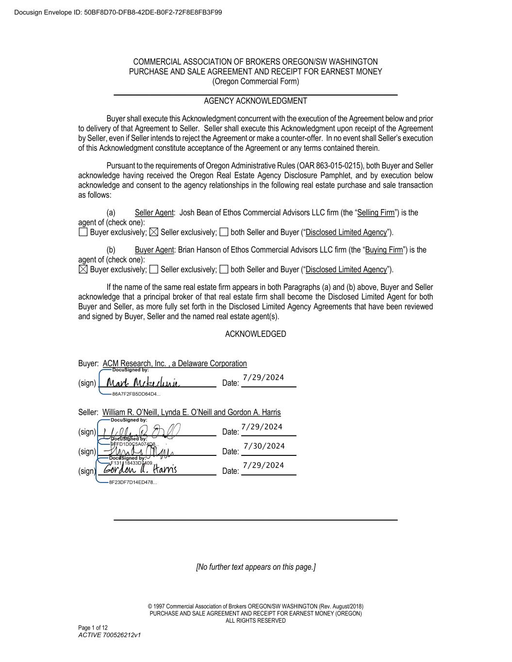 © 1997 Commercial Association of Brokers OREGON/SW WASHINGTON (Rev. August/2018) PURCHASE AND SALE AGREEMENT AND RECEIPT FOR EARNEST MONEY (OREGON) ALL RIGHTS RESERVED Page 1 of 12 ACTIVE 700526212v1 COMMERCIAL ASSOCIATION OF BROKERS OREGON/SW WASHINGTON PURCHASE AND SALE AGREEMENT AND RECEIPT FOR EARNEST MONEY (Oregon Commercial Form) ________________________________________________________________________ AGENCY ACKNOWLEDGMENT Buyer shall execute this Acknowledgment concurrent with the execution of the Agreement below and prior to delivery of that Agreement to Seller. Seller shall execute this Acknowledgment upon receipt of the Agreement by Seller, even if Seller intends to reject the Agreement or make a counter-offer. In no event shall Seller’s execution of this Acknowledgment constitute acceptance of the Agreement or any terms contained therein. Pursuant to the requirements of Oregon Administrative Rules (OAR 863-015-0215), both Buyer and Seller acknowledge having received the Oregon Real Estate Agency Disclosure Pamphlet, and by execution below acknowledge and consent to the agency relationships in the following real estate purchase and sale transaction as follows: (a) Seller Agent: Josh Bean of Ethos Commercial Advisors LLC firm (the “Selling Firm”) is the agent of (check one): Buyer exclusively; Seller exclusively; both Seller and Buyer (“Disclosed Limited Agency”). (b) Buyer Agent: Brian Hanson of Ethos Commercial Advisors LLC firm (the “Buying Firm”) is the agent of (check one): Buyer exclusively; Seller exclusively; both Seller and Buyer (“Disclosed Limited Agency”). If the name of the same real estate firm appears in both Paragraphs (a) and (b) above, Buyer and Seller acknowledge that a principal broker of that real estate firm shall become the Disclosed Limited Agent for both Buyer and Seller, as more fully set forth in the Disclosed Limited Agency Agreements that have been reviewed and signed by Buyer, Seller and the named real estate agent(s). ACKNOWLEDGED Buyer: ACM Research, Inc. , a Delaware Corporation (sign) ______________________________ Date: ______________ Seller: William R. O’Neill, Lynda E. O’Neill and Gordon A. Harris (sign) ______________________________ Date: ______________ (sign) ______________________________ Date: ______________ (sign) ______________________________ Date: ______________ ________________________________________________________________________ [No further text appears on this page.] Docusign Envelope ID: 50BF8D70-DFB8-42DE-B0F2-72F8E8FB3F99 7/29/2024 7/30/2024 7/29/2024 7/29/2024