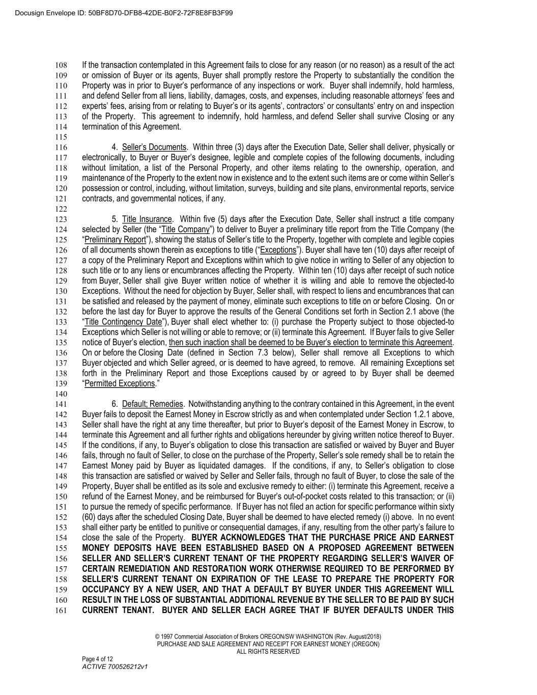 © 1997 Commercial Association of Brokers OREGON/SW WASHINGTON (Rev. August/2018) PURCHASE AND SALE AGREEMENT AND RECEIPT FOR EARNEST MONEY (OREGON) ALL RIGHTS RESERVED Page 4 of 12 ACTIVE 700526212v1 If the transaction contemplated in this Agreement fails to close for any reason (or no reason) as a result of the act 108 or omission of Buyer or its agents, Buyer shall promptly restore the Property to substantially the condition the 109 Property was in prior to Buyer’s performance of any inspections or work. Buyer shall indemnify, hold harmless, 110 and defend Seller from all liens, liability, damages, costs, and expenses, including reasonable attorneys’ fees and 111 experts’ fees, arising from or relating to Buyer’s or its agents’, contractors’ or consultants’ entry on and inspection 112 of the Property. This agreement to indemnify, hold harmless, and defend Seller shall survive Closing or any 113 termination of this Agreement. 114 115 4. Seller’s Documents. Within three (3) days after the Execution Date, Seller shall deliver, physically or 116 electronically, to Buyer or Buyer’s designee, legible and complete copies of the following documents, including 117 without limitation, a list of the Personal Property, and other items relating to the ownership, operation, and 118 maintenance of the Property to the extent now in existence and to the extent such items are or come within Seller’s 119 possession or control, including, without limitation, surveys, building and site plans, environmental reports, service 120 contracts, and governmental notices, if any. 121 122 5. Title Insurance. Within five (5) days after the Execution Date, Seller shall instruct a title company 123 selected by Seller (the “Title Company”) to deliver to Buyer a preliminary title report from the Title Company (the 124 “Preliminary Report”), showing the status of Seller’s title to the Property, together with complete and legible copies 125 of all documents shown therein as exceptions to title (“Exceptions”). Buyer shall have ten (10) days after receipt of 126 a copy of the Preliminary Report and Exceptions within which to give notice in writing to Seller of any objection to 127 such title or to any liens or encumbrances affecting the Property. Within ten (10) days after receipt of such notice 128 from Buyer, Seller shall give Buyer written notice of whether it is willing and able to remove the objected-to 129 Exceptions. Without the need for objection by Buyer, Seller shall, with respect to liens and encumbrances that can 130 be satisfied and released by the payment of money, eliminate such exceptions to title on or before Closing. On or 131 before the last day for Buyer to approve the results of the General Conditions set forth in Section 2.1 above (the 132 “Title Contingency Date”), Buyer shall elect whether to: (i) purchase the Property subject to those objected-to 133 Exceptions which Seller is not willing or able to remove; or (ii) terminate this Agreement. If Buyer fails to give Seller 134 notice of Buyer’s election, then such inaction shall be deemed to be Buyer’s election to terminate this Agreement. 135 On or before the Closing Date (defined in Section 7.3 below), Seller shall remove all Exceptions to which 136 Buyer objected and which Seller agreed, or is deemed to have agreed, to remove. All remaining Exceptions set 137 forth in the Preliminary Report and those Exceptions caused by or agreed to by Buyer shall be deemed 138 “Permitted Exceptions.” 139 140 6. Default; Remedies. Notwithstanding anything to the contrary contained in this Agreement, in the event 141 Buyer fails to deposit the Earnest Money in Escrow strictly as and when contemplated under Section 1.2.1 above, 142 Seller shall have the right at any time thereafter, but prior to Buyer’s deposit of the Earnest Money in Escrow, to 143 terminate this Agreement and all further rights and obligations hereunder by giving written notice thereof to Buyer. 144 If the conditions, if any, to Buyer’s obligation to close this transaction are satisfied or waived by Buyer and Buyer 145 fails, through no fault of Seller, to close on the purchase of the Property, Seller’s sole remedy shall be to retain the 146 Earnest Money paid by Buyer as liquidated damages. If the conditions, if any, to Seller’s obligation to close 147 this transaction are satisfied or waived by Seller and Seller fails, through no fault of Buyer, to close the sale of the 148 Property, Buyer shall be entitled as its sole and exclusive remedy to either: (i) terminate this Agreement, receive a 149 refund of the Earnest Money, and be reimbursed for Buyer’s out-of-pocket costs related to this transaction; or (ii) 150 to pursue the remedy of specific performance. If Buyer has not filed an action for specific performance within sixty 151 (60) days after the scheduled Closing Date, Buyer shall be deemed to have elected remedy (i) above. In no event 152 shall either party be entitled to punitive or consequential damages, if any, resulting from the other party’s failure to 153 close the sale of the Property. BUYER ACKNOWLEDGES THAT THE PURCHASE PRICE AND EARNEST 154 MONEY DEPOSITS HAVE BEEN ESTABLISHED BASED ON A PROPOSED AGREEMENT BETWEEN 155 SELLER AND SELLER’S CURRENT TENANT OF THE PROPERTY REGARDING SELLER’S WAIVER OF 156 CERTAIN REMEDIATION AND RESTORATION WORK OTHERWISE REQUIRED TO BE PERFORMED BY 157 SELLER’S CURRENT TENANT ON EXPIRATION OF THE LEASE TO PREPARE THE PROPERTY FOR 158 OCCUPANCY BY A NEW USER, AND THAT A DEFAULT BY BUYER UNDER THIS AGREEMENT WILL 159 RESULT IN THE LOSS OF SUBSTANTIAL ADDITIONAL REVENUE BY THE SELLER TO BE PAID BY SUCH 160 CURRENT TENANT. BUYER AND SELLER EACH AGREE THAT IF BUYER DEFAULTS UNDER THIS 161 Docusign Envelope ID: 50BF8D70-DFB8-42DE-B0F2-72F8E8FB3F99