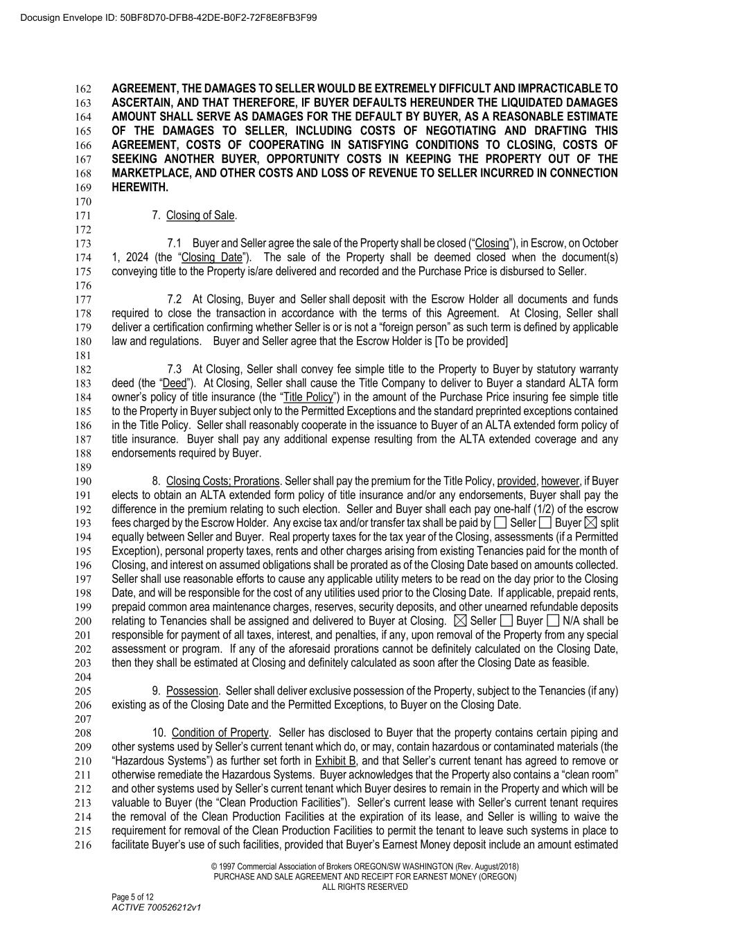 © 1997 Commercial Association of Brokers OREGON/SW WASHINGTON (Rev. August/2018) PURCHASE AND SALE AGREEMENT AND RECEIPT FOR EARNEST MONEY (OREGON) ALL RIGHTS RESERVED Page 5 of 12 ACTIVE 700526212v1 AGREEMENT, THE DAMAGES TO SELLER WOULD BE EXTREMELY DIFFICULT AND IMPRACTICABLE TO 162 ASCERTAIN, AND THAT THEREFORE, IF BUYER DEFAULTS HEREUNDER THE LIQUIDATED DAMAGES 163 AMOUNT SHALL SERVE AS DAMAGES FOR THE DEFAULT BY BUYER, AS A REASONABLE ESTIMATE 164 OF THE DAMAGES TO SELLER, INCLUDING COSTS OF NEGOTIATING AND DRAFTING THIS 165 AGREEMENT, COSTS OF COOPERATING IN SATISFYING CONDITIONS TO CLOSING, COSTS OF 166 SEEKING ANOTHER BUYER, OPPORTUNITY COSTS IN KEEPING THE PROPERTY OUT OF THE 167 MARKETPLACE, AND OTHER COSTS AND LOSS OF REVENUE TO SELLER INCURRED IN CONNECTION 168 HEREWITH. 169 170 7. Closing of Sale. 171 172 7.1 Buyer and Seller agree the sale of the Property shall be closed (“Closing”), in Escrow, on October 173 1, 2024 (the “Closing Date”). The sale of the Property shall be deemed closed when the document(s) 174 conveying title to the Property is/are delivered and recorded and the Purchase Price is disbursed to Seller. 175 176 7.2 At Closing, Buyer and Seller shall deposit with the Escrow Holder all documents and funds 177 required to close the transaction in accordance with the terms of this Agreement. At Closing, Seller shall 178 deliver a certification confirming whether Seller is or is not a “foreign person” as such term is defined by applicable 179 law and regulations. Buyer and Seller agree that the Escrow Holder is [To be provided] 180 181 7.3 At Closing, Seller shall convey fee simple title to the Property to Buyer by statutory warranty 182 deed (the “Deed”). At Closing, Seller shall cause the Title Company to deliver to Buyer a standard ALTA form 183 owner’s policy of title insurance (the “Title Policy”) in the amount of the Purchase Price insuring fee simple title 184 to the Property in Buyer subject only to the Permitted Exceptions and the standard preprinted exceptions contained 185 in the Title Policy. Seller shall reasonably cooperate in the issuance to Buyer of an ALTA extended form policy of 186 title insurance. Buyer shall pay any additional expense resulting from the ALTA extended coverage and any 187 endorsements required by Buyer. 188 189 8. Closing Costs; Prorations. Seller shall pay the premium for the Title Policy, provided, however, if Buyer 190 elects to obtain an ALTA extended form policy of title insurance and/or any endorsements, Buyer shall pay the 191 difference in the premium relating to such election. Seller and Buyer shall each pay one-half (1/2) of the escrow 192 fees charged by the Escrow Holder. Any excise tax and/or transfer tax shall be paid by Seller Buyer split 193 equally between Seller and Buyer. Real property taxes for the tax year of the Closing, assessments (if a Permitted 194 Exception), personal property taxes, rents and other charges arising from existing Tenancies paid for the month of 195 Closing, and interest on assumed obligations shall be prorated as of the Closing Date based on amounts collected. 196 Seller shall use reasonable efforts to cause any applicable utility meters to be read on the day prior to the Closing 197 Date, and will be responsible for the cost of any utilities used prior to the Closing Date. If applicable, prepaid rents, 198 prepaid common area maintenance charges, reserves, security deposits, and other unearned refundable deposits 199 relating to Tenancies shall be assigned and delivered to Buyer at Closing. Seller Buyer N/A shall be 200 responsible for payment of all taxes, interest, and penalties, if any, upon removal of the Property from any special 201 assessment or program. If any of the aforesaid prorations cannot be definitely calculated on the Closing Date, 202 then they shall be estimated at Closing and definitely calculated as soon after the Closing Date as feasible. 203 204 9. Possession. Seller shall deliver exclusive possession of the Property, subject to the Tenancies (if any) 205 existing as of the Closing Date and the Permitted Exceptions, to Buyer on the Closing Date. 206 207 10. Condition of Property. Seller has disclosed to Buyer that the property contains certain piping and 208 other systems used by Seller’s current tenant which do, or may, contain hazardous or contaminated materials (the 209 “Hazardous Systems”) as further set forth in Exhibit B, and that Seller’s current tenant has agreed to remove or 210 otherwise remediate the Hazardous Systems. Buyer acknowledges that the Property also contains a “clean room” 211 and other systems used by Seller’s current tenant which Buyer desires to remain in the Property and which will be 212 valuable to Buyer (the “Clean Production Facilities”). Seller’s current lease with Seller’s current tenant requires 213 the removal of the Clean Production Facilities at the expiration of its lease, and Seller is willing to waive the 214 requirement for removal of the Clean Production Facilities to permit the tenant to leave such systems in place to 215 facilitate Buyer’s use of such facilities, provided that Buyer’s Earnest Money deposit include an amount estimated 216 Docusign Envelope ID: 50BF8D70-DFB8-42DE-B0F2-72F8E8FB3F99