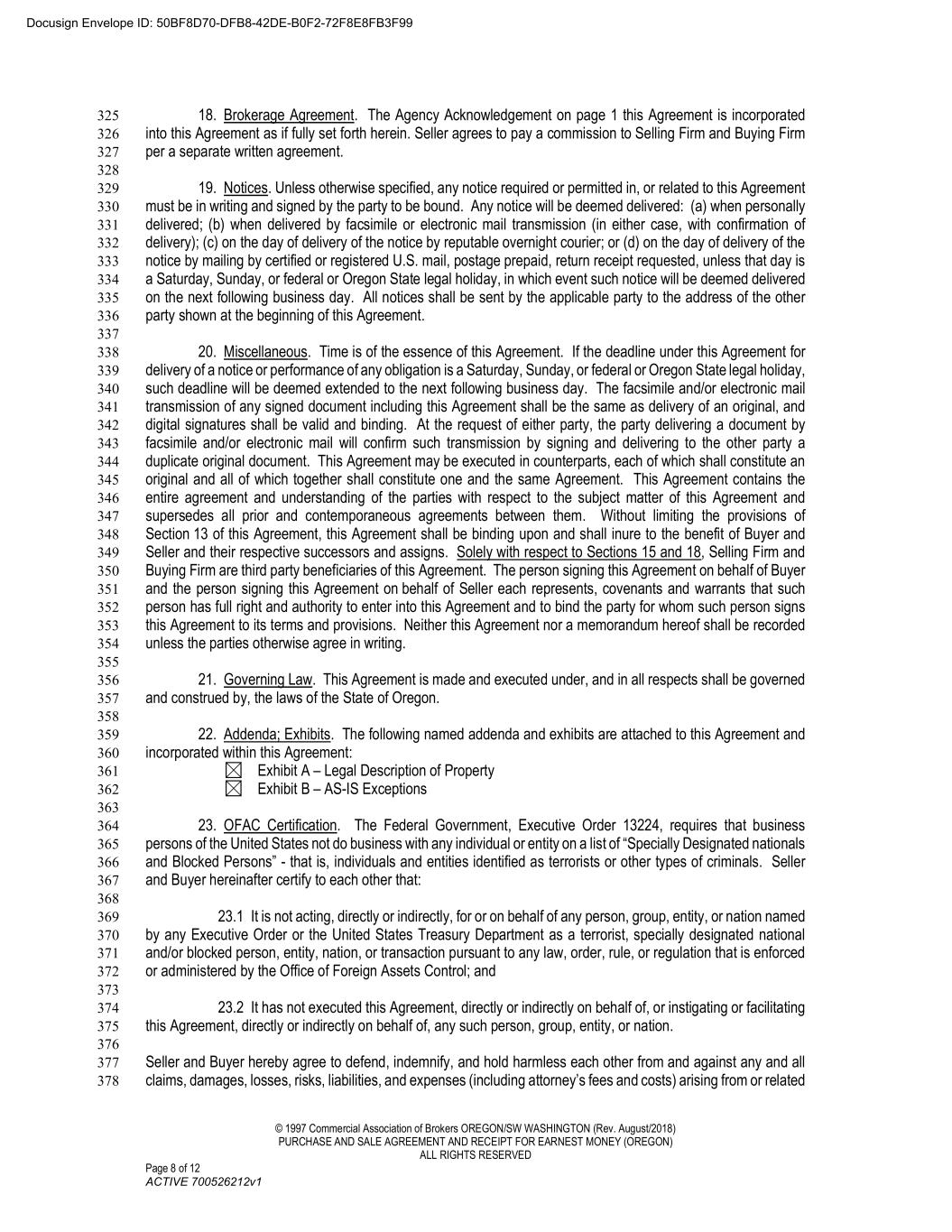 © 1997 Commercial Association of Brokers OREGON/SW WASHINGTON (Rev. August/2018) PURCHASE AND SALE AGREEMENT AND RECEIPT FOR EARNEST MONEY (OREGON) ALL RIGHTS RESERVED Page 8 of 12 ACTIVE 700526212v1 18. Brokerage Agreement. The Agency Acknowledgement on page 1 this Agreement is incorporated 325 into this Agreement as if fully set forth herein. Seller agrees to pay a commission to Selling Firm and Buying Firm 326 per a separate written agreement. 327 328 19. Notices. Unless otherwise specified, any notice required or permitted in, or related to this Agreement 329 must be in writing and signed by the party to be bound. Any notice will be deemed delivered: (a) when personally 330 delivered; (b) when delivered by facsimile or electronic mail transmission (in either case, with confirmation of 331 delivery); (c) on the day of delivery of the notice by reputable overnight courier; or (d) on the day of delivery of the 332 notice by mailing by certified or registered U.S. mail, postage prepaid, return receipt requested, unless that day is 333 a Saturday, Sunday, or federal or Oregon State legal holiday, in which event such notice will be deemed delivered 334 on the next following business day. All notices shall be sent by the applicable party to the address of the other 335 party shown at the beginning of this Agreement. 336 337 20. Miscellaneous. Time is of the essence of this Agreement. If the deadline under this Agreement for 338 delivery of a notice or performance of any obligation is a Saturday, Sunday, or federal or Oregon State legal holiday, 339 such deadline will be deemed extended to the next following business day. The facsimile and/or electronic mail 340 transmission of any signed document including this Agreement shall be the same as delivery of an original, and 341 digital signatures shall be valid and binding. At the request of either party, the party delivering a document by 342 facsimile and/or electronic mail will confirm such transmission by signing and delivering to the other party a 343 duplicate original document. This Agreement may be executed in counterparts, each of which shall constitute an 344 original and all of which together shall constitute one and the same Agreement. This Agreement contains the 345 entire agreement and understanding of the parties with respect to the subject matter of this Agreement and 346 supersedes all prior and contemporaneous agreements between them. Without limiting the provisions of 347 Section 13 of this Agreement, this Agreement shall be binding upon and shall inure to the benefit of Buyer and 348 Seller and their respective successors and assigns. Solely with respect to Sections 15 and 18, Selling Firm and 349 Buying Firm are third party beneficiaries of this Agreement. The person signing this Agreement on behalf of Buyer 350 and the person signing this Agreement on behalf of Seller each represents, covenants and warrants that such 351 person has full right and authority to enter into this Agreement and to bind the party for whom such person signs 352 this Agreement to its terms and provisions. Neither this Agreement nor a memorandum hereof shall be recorded 353 unless the parties otherwise agree in writing. 354 355 21. Governing Law. This Agreement is made and executed under, and in all respects shall be governed 356 and construed by, the laws of the State of Oregon. 357 358 22. Addenda; Exhibits. The following named addenda and exhibits are attached to this Agreement and 359 incorporated within this Agreement: 360 Exhibit A – Legal Description of Property 361 Exhibit B – AS-IS Exceptions 362 363 23. OFAC Certification. The Federal Government, Executive Order 13224, requires that business 364 persons of the United States not do business with any individual or entity on a list of “Specially Designated nationals 365 and Blocked Persons” - that is, individuals and entities identified as terrorists or other types of criminals. Seller 366 and Buyer hereinafter certify to each other that: 367 368 23.1 It is not acting, directly or indirectly, for or on behalf of any person, group, entity, or nation named 369 by any Executive Order or the United States Treasury Department as a terrorist, specially designated national 370 and/or blocked person, entity, nation, or transaction pursuant to any law, order, rule, or regulation that is enforced 371 or administered by the Office of Foreign Assets Control; and 372 373 23.2 It has not executed this Agreement, directly or indirectly on behalf of, or instigating or facilitating 374 this Agreement, directly or indirectly on behalf of, any such person, group, entity, or nation. 375 376 Seller and Buyer hereby agree to defend, indemnify, and hold harmless each other from and against any and all 377 claims, damages, losses, risks, liabilities, and expenses (including attorney’s fees and costs) arising from or related 378 Docusign Envelope ID: 50BF8D70-DFB8-42DE-B0F2-72F8E8FB3F99