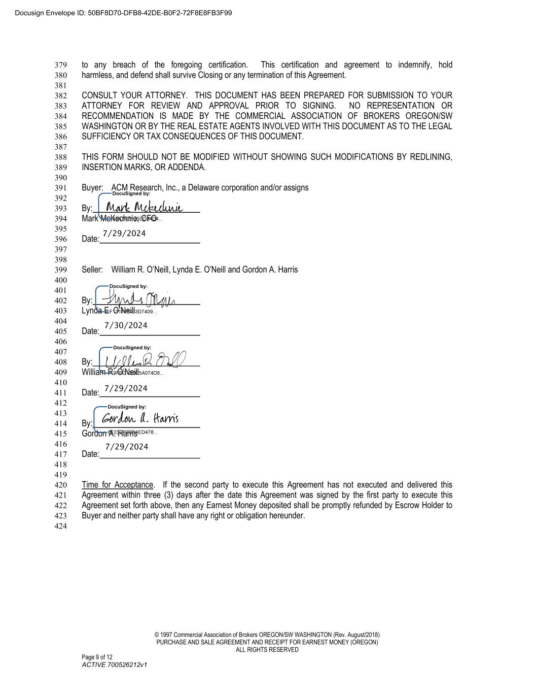 © 1997 Commercial Association of Brokers OREGON/SW WASHINGTON (Rev. August/2018) PURCHASE AND SALE AGREEMENT AND RECEIPT FOR EARNEST MONEY (OREGON) ALL RIGHTS RESERVED Page 9 of 12 ACTIVE 700526212v1 to any breach of the foregoing certification. This certification and agreement to indemnify, hold 379 harmless, and defend shall survive Closing or any termination of this Agreement. 380 381 CONSULT YOUR ATTORNEY. THIS DOCUMENT HAS BEEN PREPARED FOR SUBMISSION TO YOUR 382 ATTORNEY FOR REVIEW AND APPROVAL PRIOR TO SIGNING. NO REPRESENTATION OR 383 RECOMMENDATION IS MADE BY THE COMMERCIAL ASSOCIATION OF BROKERS OREGON/SW 384 WASHINGTON OR BY THE REAL ESTATE AGENTS INVOLVED WITH THIS DOCUMENT AS TO THE LEGAL 385 SUFFICIENCY OR TAX CONSEQUENCES OF THIS DOCUMENT. 386 387 THIS FORM SHOULD NOT BE MODIFIED WITHOUT SHOWING SUCH MODIFICATIONS BY REDLINING, 388 INSERTION MARKS, OR ADDENDA. 389 390 Buyer: ACM Research, Inc., a Delaware corporation and/or assigns 391 392 By: 393 Mark McKechnie, CFO 394 395 Date: 396 397 398 Seller: William R. O’Neill, Lynda E. O’Neill and Gordon A. Harris 399 400 401 By: 402 Lynda E. O’Neill 403 404 Date: 405 406 407 By: 408 William R. O’Neill 409 410 Date: 411 412 413 By: 414 Gordon A. Harris 415 416 Date: 417 418 419 Time for Acceptance. If the second party to execute this Agreement has not executed and delivered this 420 Agreement within three (3) days after the date this Agreement was signed by the first party to execute this 421 Agreement set forth above, then any Earnest Money deposited shall be promptly refunded by Escrow Holder to 422 Buyer and neither party shall have any right or obligation hereunder. 423 424 Docusign Envelope ID: 50BF8D70-DFB8-42DE-B0F2-72F8E8FB3F99 7/29/2024 7/30/2024 7/29/2024 7/29/2024
