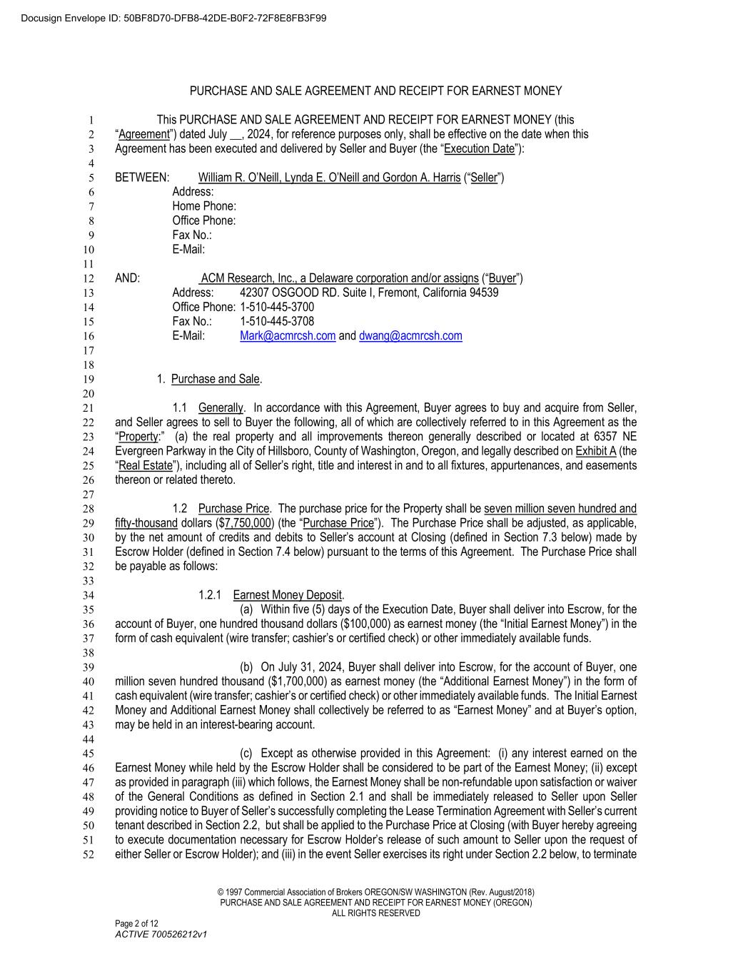 © 1997 Commercial Association of Brokers OREGON/SW WASHINGTON (Rev. August/2018) PURCHASE AND SALE AGREEMENT AND RECEIPT FOR EARNEST MONEY (OREGON) ALL RIGHTS RESERVED Page 2 of 12 ACTIVE 700526212v1 PURCHASE AND SALE AGREEMENT AND RECEIPT FOR EARNEST MONEY This PURCHASE AND SALE AGREEMENT AND RECEIPT FOR EARNEST MONEY (this 1 “Agreement”) dated July __, 2024, for reference purposes only, shall be effective on the date when this 2 Agreement has been executed and delivered by Seller and Buyer (the “Execution Date”): 3 4 BETWEEN: William R. O’Neill, Lynda E. O’Neill and Gordon A. Harris (“Seller”) 5 Address: 6 Home Phone: 7 Office Phone: 8 Fax No.: 9 E-Mail: 10 11 AND: ACM Research, Inc., a Delaware corporation and/or assigns (“Buyer”) 12 Address: 42307 OSGOOD RD. Suite I, Fremont, California 94539 13 Office Phone: 1-510-445-3700 14 Fax No.: 1-510-445-3708 15 E-Mail: Mark@acmrcsh.com and dwang@acmrcsh.com 16 17 18 1. Purchase and Sale. 19 20 1.1 Generally. In accordance with this Agreement, Buyer agrees to buy and acquire from Seller, 21 and Seller agrees to sell to Buyer the following, all of which are collectively referred to in this Agreement as the 22 “Property:” (a) the real property and all improvements thereon generally described or located at 6357 NE 23 Evergreen Parkway in the City of Hillsboro, County of Washington, Oregon, and legally described on Exhibit A (the 24 “Real Estate”), including all of Seller’s right, title and interest in and to all fixtures, appurtenances, and easements 25 thereon or related thereto. 26 27 1.2 Purchase Price. The purchase price for the Property shall be seven million seven hundred and 28 fifty-thousand dollars ($7,750,000) (the “Purchase Price”). The Purchase Price shall be adjusted, as applicable, 29 by the net amount of credits and debits to Seller’s account at Closing (defined in Section 7.3 below) made by 30 Escrow Holder (defined in Section 7.4 below) pursuant to the terms of this Agreement. The Purchase Price shall 31 be payable as follows: 32 33 1.2.1 Earnest Money Deposit. 34 (a) Within five (5) days of the Execution Date, Buyer shall deliver into Escrow, for the 35 account of Buyer, one hundred thousand dollars ($100,000) as earnest money (the “Initial Earnest Money”) in the 36 form of cash equivalent (wire transfer; cashier’s or certified check) or other immediately available funds. 37 38 (b) On July 31, 2024, Buyer shall deliver into Escrow, for the account of Buyer, one 39 million seven hundred thousand ($1,700,000) as earnest money (the “Additional Earnest Money”) in the form of 40 cash equivalent (wire transfer; cashier’s or certified check) or other immediately available funds. The Initial Earnest 41 Money and Additional Earnest Money shall collectively be referred to as “Earnest Money” and at Buyer’s option, 42 may be held in an interest-bearing account. 43 44 (c) Except as otherwise provided in this Agreement: (i) any interest earned on the 45 Earnest Money while held by the Escrow Holder shall be considered to be part of the Earnest Money; (ii) except 46 as provided in paragraph (iii) which follows, the Earnest Money shall be non-refundable upon satisfaction or waiver 47 of the General Conditions as defined in Section 2.1 and shall be immediately released to Seller upon Seller 48 providing notice to Buyer of Seller’s successfully completing the Lease Termination Agreement with Seller’s current 49 tenant described in Section 2.2, but shall be applied to the Purchase Price at Closing (with Buyer hereby agreeing 50 to execute documentation necessary for Escrow Holder’s release of such amount to Seller upon the request of 51 either Seller or Escrow Holder); and (iii) in the event Seller exercises its right under Section 2.2 below, to terminate 52 Docusign Envelope ID: 50BF8D70-DFB8-42DE-B0F2-72F8E8FB3F99