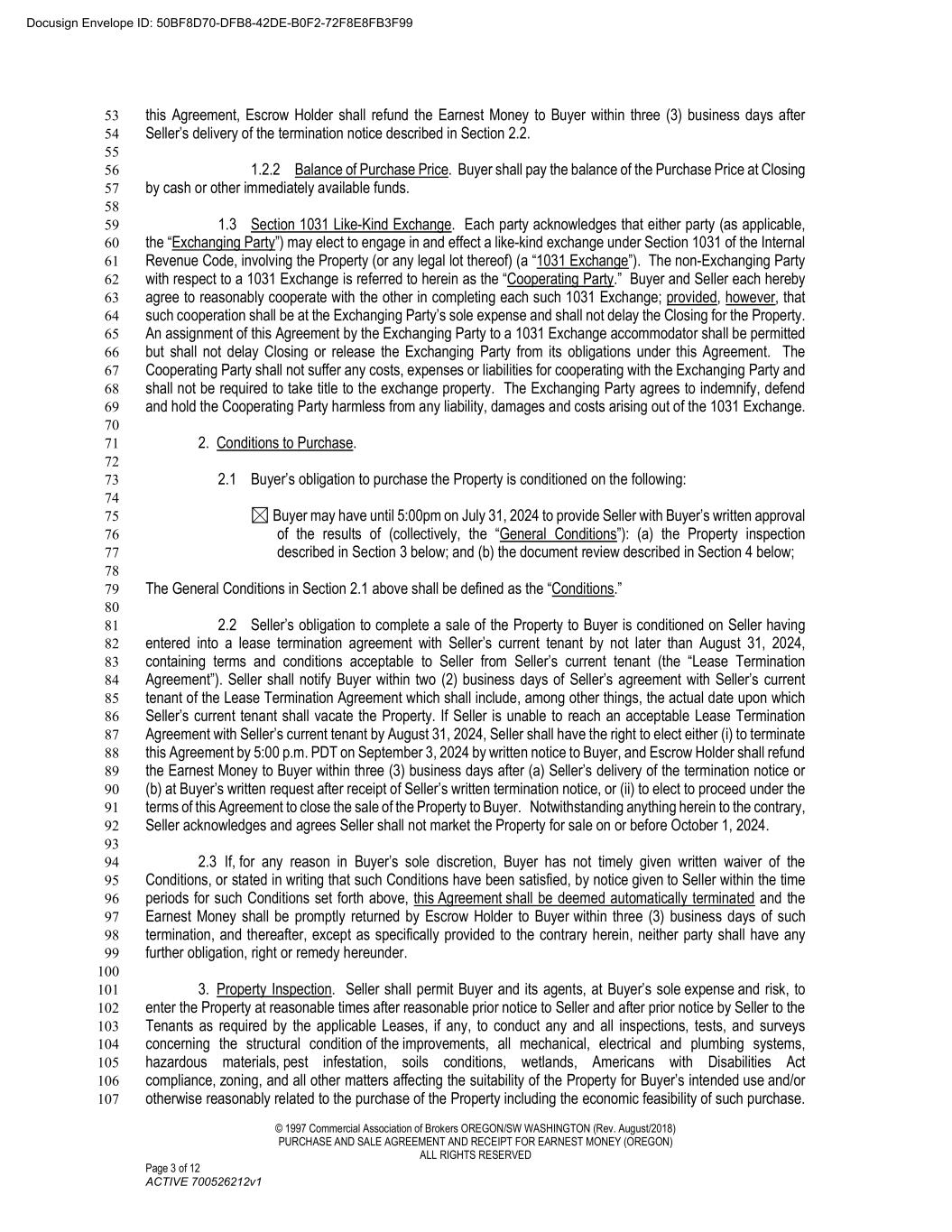 © 1997 Commercial Association of Brokers OREGON/SW WASHINGTON (Rev. August/2018) PURCHASE AND SALE AGREEMENT AND RECEIPT FOR EARNEST MONEY (OREGON) ALL RIGHTS RESERVED Page 3 of 12 ACTIVE 700526212v1 this Agreement, Escrow Holder shall refund the Earnest Money to Buyer within three (3) business days after 53 Seller’s delivery of the termination notice described in Section 2.2. 54 55 1.2.2 Balance of Purchase Price. Buyer shall pay the balance of the Purchase Price at Closing 56 by cash or other immediately available funds. 57 58 1.3 Section 1031 Like-Kind Exchange. Each party acknowledges that either party (as applicable, 59 the “Exchanging Party”) may elect to engage in and effect a like-kind exchange under Section 1031 of the Internal 60 Revenue Code, involving the Property (or any legal lot thereof) (a “1031 Exchange”). The non-Exchanging Party 61 with respect to a 1031 Exchange is referred to herein as the “Cooperating Party.” Buyer and Seller each hereby 62 agree to reasonably cooperate with the other in completing each such 1031 Exchange; provided, however, that 63 such cooperation shall be at the Exchanging Party’s sole expense and shall not delay the Closing for the Property. 64 An assignment of this Agreement by the Exchanging Party to a 1031 Exchange accommodator shall be permitted 65 but shall not delay Closing or release the Exchanging Party from its obligations under this Agreement. The 66 Cooperating Party shall not suffer any costs, expenses or liabilities for cooperating with the Exchanging Party and 67 shall not be required to take title to the exchange property. The Exchanging Party agrees to indemnify, defend 68 and hold the Cooperating Party harmless from any liability, damages and costs arising out of the 1031 Exchange. 69 70 2. Conditions to Purchase. 71 72 2.1 Buyer’s obligation to purchase the Property is conditioned on the following: 73 74 Buyer may have until 5:00pm on July 31, 2024 to provide Seller with Buyer’s written approval 75 of the results of (collectively, the “General Conditions”): (a) the Property inspection 76 described in Section 3 below; and (b) the document review described in Section 4 below; 77 78 The General Conditions in Section 2.1 above shall be defined as the “Conditions.” 79 80 2.2 Seller’s obligation to complete a sale of the Property to Buyer is conditioned on Seller having 81 entered into a lease termination agreement with Seller’s current tenant by not later than August 31, 2024, 82 containing terms and conditions acceptable to Seller from Seller’s current tenant (the “Lease Termination 83 Agreement”). Seller shall notify Buyer within two (2) business days of Seller’s agreement with Seller’s current 84 tenant of the Lease Termination Agreement which shall include, among other things, the actual date upon which 85 Seller’s current tenant shall vacate the Property. If Seller is unable to reach an acceptable Lease Termination 86 Agreement with Seller’s current tenant by August 31, 2024, Seller shall have the right to elect either (i) to terminate 87 this Agreement by 5:00 p.m. PDT on September 3, 2024 by written notice to Buyer, and Escrow Holder shall refund 88 the Earnest Money to Buyer within three (3) business days after (a) Seller’s delivery of the termination notice or 89 (b) at Buyer’s written request after receipt of Seller’s written termination notice, or (ii) to elect to proceed under the 90 terms of this Agreement to close the sale of the Property to Buyer. Notwithstanding anything herein to the contrary, 91 Seller acknowledges and agrees Seller shall not market the Property for sale on or before October 1, 2024. 92 93 2.3 If, for any reason in Buyer’s sole discretion, Buyer has not timely given written waiver of the 94 Conditions, or stated in writing that such Conditions have been satisfied, by notice given to Seller within the time 95 periods for such Conditions set forth above, this Agreement shall be deemed automatically terminated and the 96 Earnest Money shall be promptly returned by Escrow Holder to Buyer within three (3) business days of such 97 termination, and thereafter, except as specifically provided to the contrary herein, neither party shall have any 98 further obligation, right or remedy hereunder. 99 100 3. Property Inspection. Seller shall permit Buyer and its agents, at Buyer’s sole expense and risk, to 101 enter the Property at reasonable times after reasonable prior notice to Seller and after prior notice by Seller to the 102 Tenants as required by the applicable Leases, if any, to conduct any and all inspections, tests, and surveys 103 concerning the structural condition of the improvements, all mechanical, electrical and plumbing systems, 104 hazardous materials, pest infestation, soils conditions, wetlands, Americans with Disabilities Act 105 compliance, zoning, and all other matters affecting the suitability of the Property for Buyer’s intended use and/or 106 otherwise reasonably related to the purchase of the Property including the economic feasibility of such purchase. 107 Docusign Envelope ID: 50BF8D70-DFB8-42DE-B0F2-72F8E8FB3F99