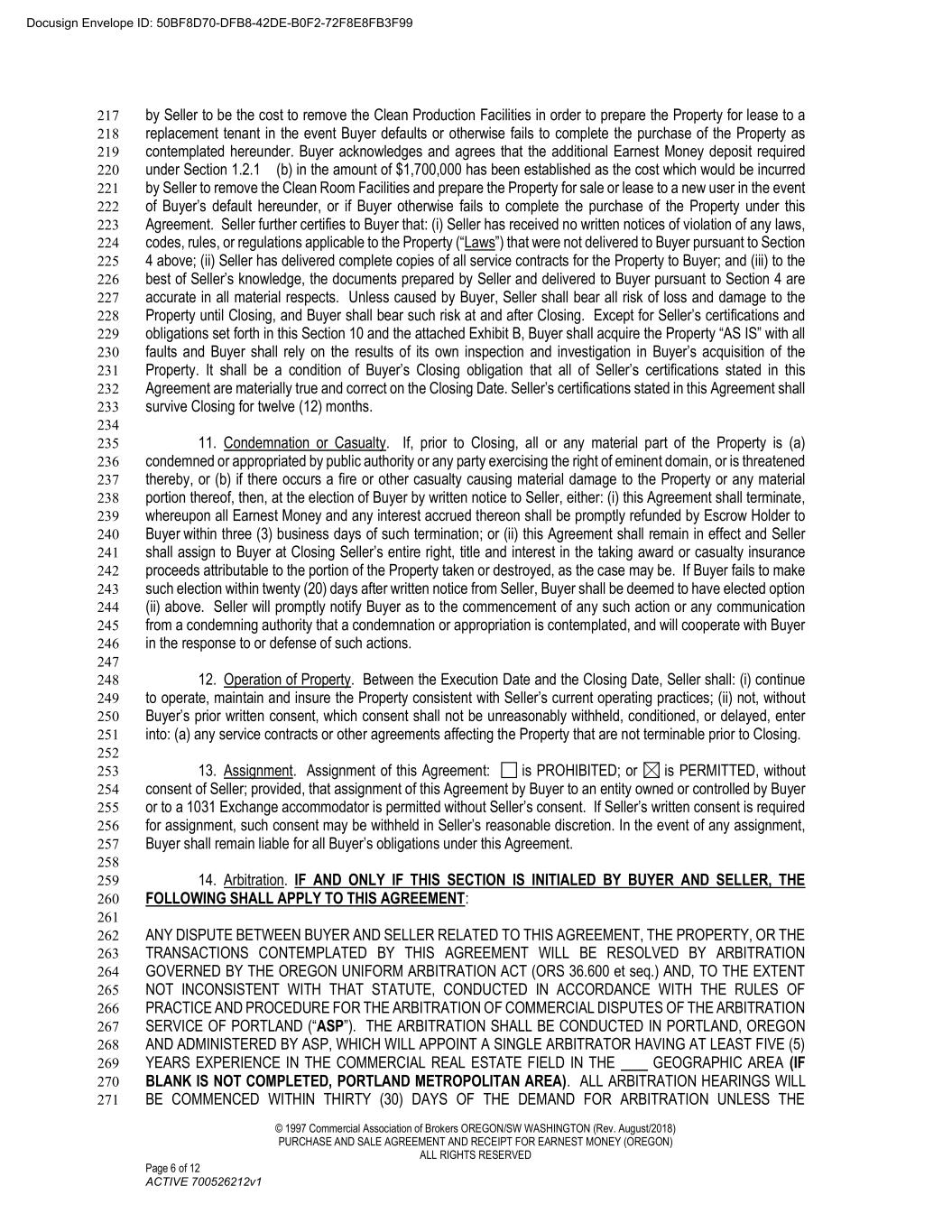 © 1997 Commercial Association of Brokers OREGON/SW WASHINGTON (Rev. August/2018) PURCHASE AND SALE AGREEMENT AND RECEIPT FOR EARNEST MONEY (OREGON) ALL RIGHTS RESERVED Page 6 of 12 ACTIVE 700526212v1 by Seller to be the cost to remove the Clean Production Facilities in order to prepare the Property for lease to a 217 replacement tenant in the event Buyer defaults or otherwise fails to complete the purchase of the Property as 218 contemplated hereunder. Buyer acknowledges and agrees that the additional Earnest Money deposit required 219 under Section 1.2.1 (b) in the amount of $1,700,000 has been established as the cost which would be incurred 220 by Seller to remove the Clean Room Facilities and prepare the Property for sale or lease to a new user in the event 221 of Buyer’s default hereunder, or if Buyer otherwise fails to complete the purchase of the Property under this 222 Agreement. Seller further certifies to Buyer that: (i) Seller has received no written notices of violation of any laws, 223 codes, rules, or regulations applicable to the Property (“Laws”) that were not delivered to Buyer pursuant to Section 224 4 above; (ii) Seller has delivered complete copies of all service contracts for the Property to Buyer; and (iii) to the 225 best of Seller’s knowledge, the documents prepared by Seller and delivered to Buyer pursuant to Section 4 are 226 accurate in all material respects. Unless caused by Buyer, Seller shall bear all risk of loss and damage to the 227 Property until Closing, and Buyer shall bear such risk at and after Closing. Except for Seller’s certifications and 228 obligations set forth in this Section 10 and the attached Exhibit B, Buyer shall acquire the Property “AS IS” with all 229 faults and Buyer shall rely on the results of its own inspection and investigation in Buyer’s acquisition of the 230 Property. It shall be a condition of Buyer’s Closing obligation that all of Seller’s certifications stated in this 231 Agreement are materially true and correct on the Closing Date. Seller’s certifications stated in this Agreement shall 232 survive Closing for twelve (12) months. 233 234 11. Condemnation or Casualty. If, prior to Closing, all or any material part of the Property is (a) 235 condemned or appropriated by public authority or any party exercising the right of eminent domain, or is threatened 236 thereby, or (b) if there occurs a fire or other casualty causing material damage to the Property or any material 237 portion thereof, then, at the election of Buyer by written notice to Seller, either: (i) this Agreement shall terminate, 238 whereupon all Earnest Money and any interest accrued thereon shall be promptly refunded by Escrow Holder to 239 Buyer within three (3) business days of such termination; or (ii) this Agreement shall remain in effect and Seller 240 shall assign to Buyer at Closing Seller’s entire right, title and interest in the taking award or casualty insurance 241 proceeds attributable to the portion of the Property taken or destroyed, as the case may be. If Buyer fails to make 242 such election within twenty (20) days after written notice from Seller, Buyer shall be deemed to have elected option 243 (ii) above. Seller will promptly notify Buyer as to the commencement of any such action or any communication 244 from a condemning authority that a condemnation or appropriation is contemplated, and will cooperate with Buyer 245 in the response to or defense of such actions. 246 247 12. Operation of Property. Between the Execution Date and the Closing Date, Seller shall: (i) continue 248 to operate, maintain and insure the Property consistent with Seller’s current operating practices; (ii) not, without 249 Buyer’s prior written consent, which consent shall not be unreasonably withheld, conditioned, or delayed, enter 250 into: (a) any service contracts or other agreements affecting the Property that are not terminable prior to Closing. 251 252 13. Assignment. Assignment of this Agreement: is PROHIBITED; or is PERMITTED, without 253 consent of Seller; provided, that assignment of this Agreement by Buyer to an entity owned or controlled by Buyer 254 or to a 1031 Exchange accommodator is permitted without Seller’s consent. If Seller’s written consent is required 255 for assignment, such consent may be withheld in Seller’s reasonable discretion. In the event of any assignment, 256 Buyer shall remain liable for all Buyer’s obligations under this Agreement. 257 258 14. Arbitration. IF AND ONLY IF THIS SECTION IS INITIALED BY BUYER AND SELLER, THE 259 FOLLOWING SHALL APPLY TO THIS AGREEMENT: 260 261 ANY DISPUTE BETWEEN BUYER AND SELLER RELATED TO THIS AGREEMENT, THE PROPERTY, OR THE 262 TRANSACTIONS CONTEMPLATED BY THIS AGREEMENT WILL BE RESOLVED BY ARBITRATION 263 GOVERNED BY THE OREGON UNIFORM ARBITRATION ACT (ORS 36.600 et seq.) AND, TO THE EXTENT 264 NOT INCONSISTENT WITH THAT STATUTE, CONDUCTED IN ACCORDANCE WITH THE RULES OF 265 PRACTICE AND PROCEDURE FOR THE ARBITRATION OF COMMERCIAL DISPUTES OF THE ARBITRATION 266 SERVICE OF PORTLAND (“ASP”). THE ARBITRATION SHALL BE CONDUCTED IN PORTLAND, OREGON 267 AND ADMINISTERED BY ASP, WHICH WILL APPOINT A SINGLE ARBITRATOR HAVING AT LEAST FIVE (5) 268 YEARS EXPERIENCE IN THE COMMERCIAL REAL ESTATE FIELD IN THE GEOGRAPHIC AREA (IF 269 BLANK IS NOT COMPLETED, PORTLAND METROPOLITAN AREA). ALL ARBITRATION HEARINGS WILL 270 BE COMMENCED WITHIN THIRTY (30) DAYS OF THE DEMAND FOR ARBITRATION UNLESS THE 271 Docusign Envelope ID: 50BF8D70-DFB8-42DE-B0F2-72F8E8FB3F99