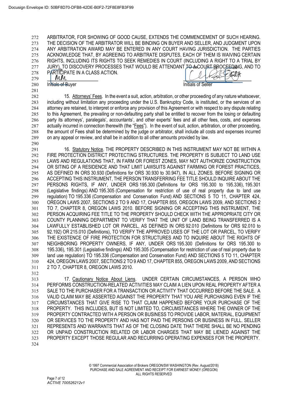 © 1997 Commercial Association of Brokers OREGON/SW WASHINGTON (Rev. August/2018) PURCHASE AND SALE AGREEMENT AND RECEIPT FOR EARNEST MONEY (OREGON) ALL RIGHTS RESERVED Page 7 of 12 ACTIVE 700526212v1 ARBITRATOR, FOR SHOWING OF GOOD CAUSE, EXTENDS THE COMMENCEMENT OF SUCH HEARING. 272 THE DECISION OF THE ARBITRATOR WILL BE BINDING ON BUYER AND SELLER, AND JUDGMENT UPON 273 ANY ARBITRATION AWARD MAY BE ENTERED IN ANY COURT HAVING JURISDICTION. THE PARTIES 274 ACKNOWLEDGE THAT, BY AGREEING TO ARBITRATE DISPUTES, EACH OF THEM IS WAIVING CERTAIN 275 RIGHTS, INCLUDING ITS RIGHTS TO SEEK REMEDIES IN COURT (INCLUDING A RIGHT TO A TRIAL BY 276 JURY), TO DISCOVERY PROCESSES THAT WOULD BE ATTENDANT TO A COURT PROCEEDING, AND TO 277 PARTICIPATE IN A CLASS ACTION. 278 279 Initials of Buyer Initials of Seller 280 281 15. Attorneys’ Fees. In the event a suit, action, arbitration, or other proceeding of any nature whatsoever, 282 including without limitation any proceeding under the U.S. Bankruptcy Code, is instituted, or the services of an 283 attorney are retained, to interpret or enforce any provision of this Agreement or with respect to any dispute relating 284 to this Agreement, the prevailing or non-defaulting party shall be entitled to recover from the losing or defaulting 285 party its attorneys’, paralegals’, accountants’, and other experts’ fees and all other fees, costs, and expenses 286 actually incurred in connection therewith (the “Fees”). In the event of suit, action, arbitration, or other proceeding, 287 the amount of Fees shall be determined by the judge or arbitrator, shall include all costs and expenses incurred 288 on any appeal or review, and shall be in addition to all other amounts provided by law. 289 290 16. Statutory Notice. THE PROPERTY DESCRIBED IN THIS INSTRUMENT MAY NOT BE WITHIN A 291 FIRE PROTECTION DISTRICT PROTECTING STRUCTURES. THE PROPERTY IS SUBJECT TO LAND USE 292 LAWS AND REGULATIONS THAT, IN FARM OR FOREST ZONES, MAY NOT AUTHORIZE CONSTRUCTION 293 OR SITING OF A RESIDENCE AND THAT LIMIT LAWSUITS AGAINST FARMING OR FOREST PRACTICES, 294 AS DEFINED IN ORS 30.930 (Definitions for ORS 30.930 to 30.947), IN ALL ZONES. BEFORE SIGNING OR 295 ACCEPTING THIS INSTRUMENT, THE PERSON TRANSFERRING FEE TITLE SHOULD INQUIRE ABOUT THE 296 PERSONS RIGHTS, IF ANY, UNDER ORS 195.300 (Definitions for ORS 195.300 to 195.336), 195.301 297 (Legislative findings) AND 195.305 (Compensation for restriction of use of real property due to land use 298 regulation) TO 195.336 (Compensation and Conservation Fund) AND SECTIONS 5 TO 11, CHAPTER 424, 299 OREGON LAWS 2007, SECTIONS 2 TO 9 AND 17, CHAPTER 855, OREGON LAWS 2009, AND SECTIONS 2 300 TO 7, CHAPTER 8, OREGON LAWS 2010. BEFORE SIGNING OR ACCEPTING THIS INSTRUMENT, THE 301 PERSON ACQUIRING FEE TITLE TO THE PROPERTY SHOULD CHECK WITH THE APPROPRIATE CITY OR 302 COUNTY PLANNING DEPARTMENT TO VERIFY THAT THE UNIT OF LAND BEING TRANSFERRED IS A 303 LAWFULLY ESTABLISHED LOT OR PARCEL, AS DEFINED IN ORS 92.010 (Definitions for ORS 92.010 to 304 92.192) OR 215.010 (Definitions), TO VERIFY THE APPROVED USES OF THE LOT OR PARCEL, TO VERIFY 305 THE EXISTENCE OF FIRE PROTECTION FOR STRUCTURES AND TO INQUIRE ABOUT THE RIGHTS OF 306 NEIGHBORING PROPERTY OWNERS, IF ANY, UNDER ORS 195.300 (Definitions for ORS 195.300 to 307 195.336), 195.301 (Legislative findings) AND 195.305 (Compensation for restriction of use of real property due to 308 land use regulation) TO 195.336 (Compensation and Conservation Fund) AND SECTIONS 5 TO 11, CHAPTER 309 424, OREGON LAWS 2007, SECTIONS 2 TO 9 AND 17, CHAPTER 855, OREGON LAWS 2009, AND SECTIONS 310 2 TO 7, CHAPTER 8, OREGON LAWS 2010. 311 312 17. Cautionary Notice About Liens. UNDER CERTAIN CIRCUMSTANCES, A PERSON WHO 313 PERFORMS CONSTRUCTION-RELATED ACTIVITIES MAY CLAIM A LIEN UPON REAL PROPERTY AFTER A 314 SALE TO THE PURCHASER FOR A TRANSACTION OR ACTIVITY THAT OCCURRED BEFORE THE SALE. A 315 VALID CLAIM MAY BE ASSERTED AGAINST THE PROPERTY THAT YOU ARE PURCHASING EVEN IF THE 316 CIRCUMSTANCES THAT GIVE RISE TO THAT CLAIM HAPPENED BEFORE YOUR PURCHASE OF THE 317 PROPERTY. THIS INCLUDES, BUT IS NOT LIMITED TO, CIRCUMSTANCES WHERE THE OWNER OF THE 318 PROPERTY CONTRACTED WITH A PERSON OR BUSINESS TO PROVIDE LABOR, MATERIAL, EQUIPMENT 319 OR SERVICES TO THE PROPERTY AND HAS NOT PAID THE PERSONS OR BUSINESS IN FULL. SELLER 320 REPRESENTS AND WARRANTS THAT AS OF THE CLOSING DATE THAT THERE SHALL BE NO PENDING 321 OR UNPAID CONSTRUCTION RELATED OR LABOR CHARGES THAT MAY BE LIENED AGAINST THE 322 PROPERTY EXCEPT THOSE REGULAR AND RECURRING OPERATING EXPENSES FOR THE PROPERTY. 323 324 Docusign Envelope ID: 50BF8D70-DFB8-42DE-B0F2-72F8E8FB3F99