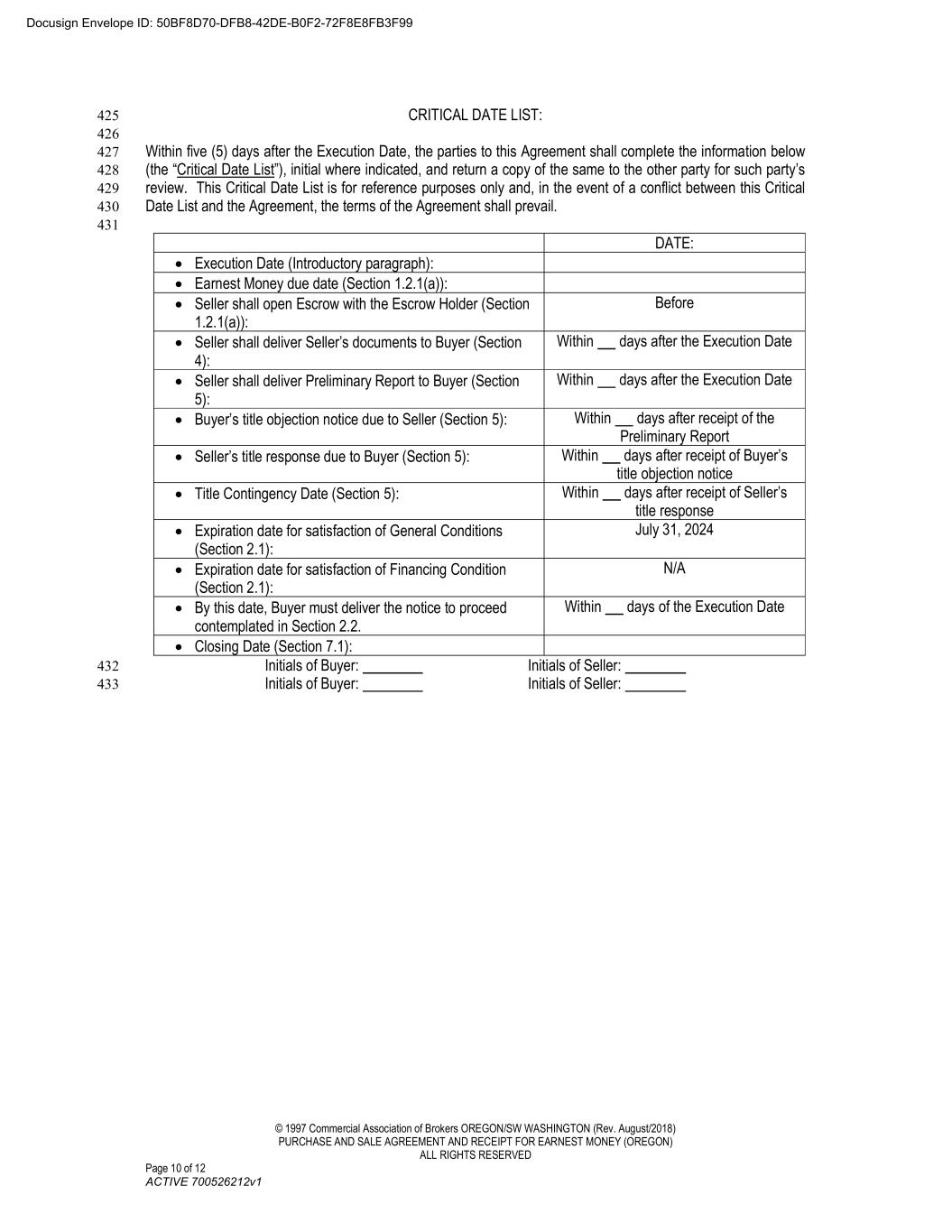© 1997 Commercial Association of Brokers OREGON/SW WASHINGTON (Rev. August/2018) PURCHASE AND SALE AGREEMENT AND RECEIPT FOR EARNEST MONEY (OREGON) ALL RIGHTS RESERVED Page 10 of 12 ACTIVE 700526212v1 CRITICAL DATE LIST: 425 426 Within five (5) days after the Execution Date, the parties to this Agreement shall complete the information below 427 (the “Critical Date List”), initial where indicated, and return a copy of the same to the other party for such party’s 428 review. This Critical Date List is for reference purposes only and, in the event of a conflict between this Critical 429 Date List and the Agreement, the terms of the Agreement shall prevail. 430 431 DATE:  Execution Date (Introductory paragraph):  Earnest Money due date (Section 1.2.1(a)):  Seller shall open Escrow with the Escrow Holder (Section 1.2.1(a)): Before  Seller shall deliver Seller’s documents to Buyer (Section 4): Within days after the Execution Date  Seller shall deliver Preliminary Report to Buyer (Section 5): Within days after the Execution Date  Buyer’s title objection notice due to Seller (Section 5): Within days after receipt of the Preliminary Report  Seller’s title response due to Buyer (Section 5): Within days after receipt of Buyer’s title objection notice  Title Contingency Date (Section 5): Within days after receipt of Seller’s title response  Expiration date for satisfaction of General Conditions (Section 2.1): July 31, 2024  Expiration date for satisfaction of Financing Condition (Section 2.1): N/A  By this date, Buyer must deliver the notice to proceed contemplated in Section 2.2. Within days of the Execution Date  Closing Date (Section 7.1): Initials of Buyer: Initials of Seller: 432 Initials of Buyer: Initials of Seller: 433 Docusign Envelope ID: 50BF8D70-DFB8-42DE-B0F2-72F8E8FB3F99