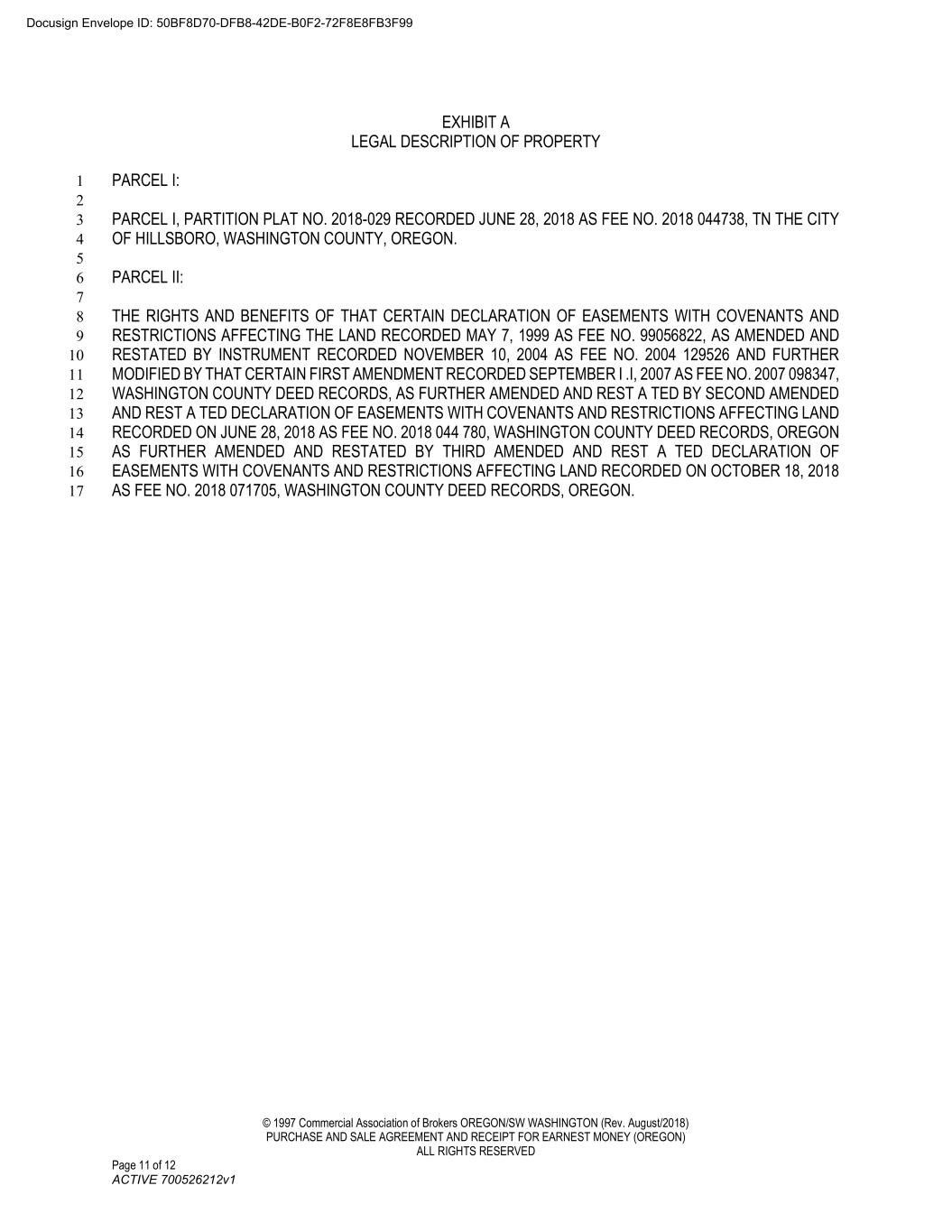© 1997 Commercial Association of Brokers OREGON/SW WASHINGTON (Rev. August/2018) PURCHASE AND SALE AGREEMENT AND RECEIPT FOR EARNEST MONEY (OREGON) ALL RIGHTS RESERVED Page 11 of 12 ACTIVE 700526212v1 EXHIBIT A LEGAL DESCRIPTION OF PROPERTY PARCEL I: 1 2 PARCEL I, PARTITION PLAT NO. 2018-029 RECORDED JUNE 28, 2018 AS FEE NO. 2018 044738, TN THE CITY 3 OF HILLSBORO, WASHINGTON COUNTY, OREGON. 4 5 PARCEL II: 6 7 THE RIGHTS AND BENEFITS OF THAT CERTAIN DECLARATION OF EASEMENTS WITH COVENANTS AND 8 RESTRICTIONS AFFECTING THE LAND RECORDED MAY 7, 1999 AS FEE NO. 99056822, AS AMENDED AND 9 RESTATED BY INSTRUMENT RECORDED NOVEMBER 10, 2004 AS FEE NO. 2004 129526 AND FURTHER 10 MODIFIED BY THAT CERTAIN FIRST AMENDMENT RECORDED SEPTEMBER I .I, 2007 AS FEE NO. 2007 098347, 11 WASHINGTON COUNTY DEED RECORDS, AS FURTHER AMENDED AND REST A TED BY SECOND AMENDED 12 AND REST A TED DECLARATION OF EASEMENTS WITH COVENANTS AND RESTRICTIONS AFFECTING LAND 13 RECORDED ON JUNE 28, 2018 AS FEE NO. 2018 044 780, WASHINGTON COUNTY DEED RECORDS, OREGON 14 AS FURTHER AMENDED AND RESTATED BY THIRD AMENDED AND REST A TED DECLARATION OF 15 EASEMENTS WITH COVENANTS AND RESTRICTIONS AFFECTING LAND RECORDED ON OCTOBER 18, 2018 16 AS FEE NO. 2018 071705, WASHINGTON COUNTY DEED RECORDS, OREGON. 17 Docusign Envelope ID: 50BF8D70-DFB8-42DE-B0F2-72F8E8FB3F99