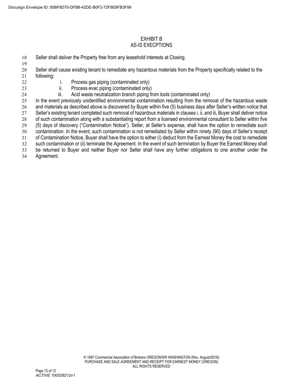 © 1997 Commercial Association of Brokers OREGON/SW WASHINGTON (Rev. August/2018) PURCHASE AND SALE AGREEMENT AND RECEIPT FOR EARNEST MONEY (OREGON) ALL RIGHTS RESERVED Page 12 of 12 ACTIVE 700526212v1 EXHIBIT B AS-IS EXECPTIONS Seller shall deliver the Property free from any leasehold interests at Closing. 18 19 Seller shall cause existing tenant to remediate any hazardous materials from the Property specifically related to the 20 following: 21 i. Process gas piping (contaminated only) 22 ii. Process evac piping (contaminated only) 23 iii. Acid waste neutralization branch piping from tools (contaminated only) 24 In the event previously unidentified environmental contamination resulting from the removal of the hazardous waste 25 and materials as described above is discovered by Buyer within five (5) business days after Seller’s written notice that 26 Seller’s existing tenant completed such removal of hazardous materials in clauses i, ii, and iii, Buyer shall deliver notice 27 of such contamination along with a substantiating report from a licensed environmental consultant to Seller within five 28 (5) days of discovery (“Contamination Notice”). Seller, at Seller’s expense, shall have the option to remediate such 29 contamination. In the event, such contamination is not remediated by Seller within ninety (90) days of Seller’s receipt 30 of Contamination Notice, Buyer shall have the option to either (i) deduct from the Earnest Money the cost to remediate 31 such contamination or (ii) terminate the Agreement. In the event of such termination by Buyer the Earnest Money shall 32 be returned to Buyer and neither Buyer nor Seller shall have any further obligations to one another under the 33 Agreement. 34 Docusign Envelope ID: 50BF8D70-DFB8-42DE-B0F2-72F8E8FB3F99