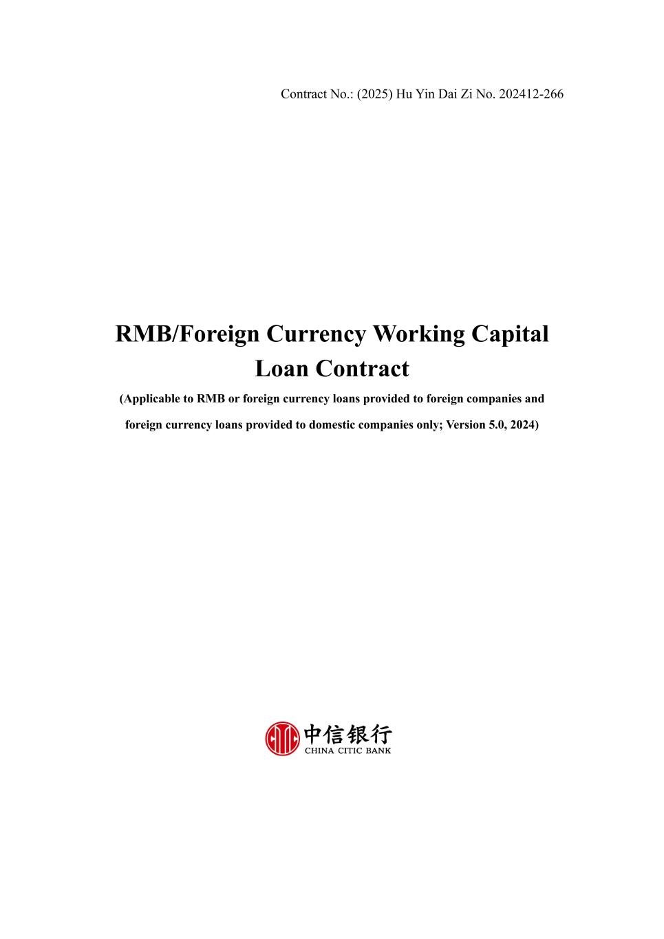 Contract No.: (2025) Hu Yin Dai Zi No. 202412-266 RMB/Foreign Currency Working Capital Loan Contract (Applicable to RMB or foreign currency loans provided to foreign companies and foreign currency loans provided to domestic companies only; Version 5.0, 2024)