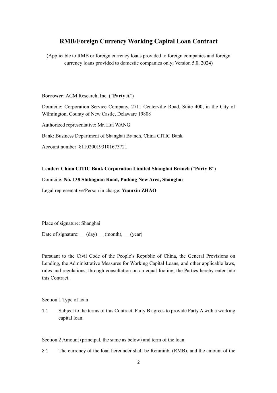 2 RMB/Foreign Currency Working Capital Loan Contract (Applicable to RMB or foreign currency loans provided to foreign companies and foreign currency loans provided to domestic companies only; Version 5.0, 2024) Borrower: ACM Research, Inc. (“Party A”) Domicile: Corporation Service Company, 2711 Centerville Road, Suite 400, in the City of Wilmington, County of New Castle, Delaware 19808 Authorized representative: Mr. Hui WANG Bank: Business Department of Shanghai Branch, China CITIC Bank Account number: 8110200193101673721 Lender: China CITIC Bank Corporation Limited Shanghai Branch (“Party B”) Domicile: No. 138 Shiboguan Road, Pudong New Area, Shanghai Legal representative/Person in charge: Yuanxin ZHAO Place of signature: Shanghai Date of signature: __ (day) __ (month), __ (year) Pursuant to the Civil Code of the People’s Republic of China, the General Provisions on Lending, the Administrative Measures for Working Capital Loans, and other applicable laws, rules and regulations, through consultation on an equal footing, the Parties hereby enter into this Contract. Section 1 Type of loan 1.1 Subject to the terms of this Contract, Party B agrees to provide Party A with a working capital loan. Section 2 Amount (principal, the same as below) and term of the loan 2.1 The currency of the loan hereunder shall be Renminbi (RMB), and the amount of the