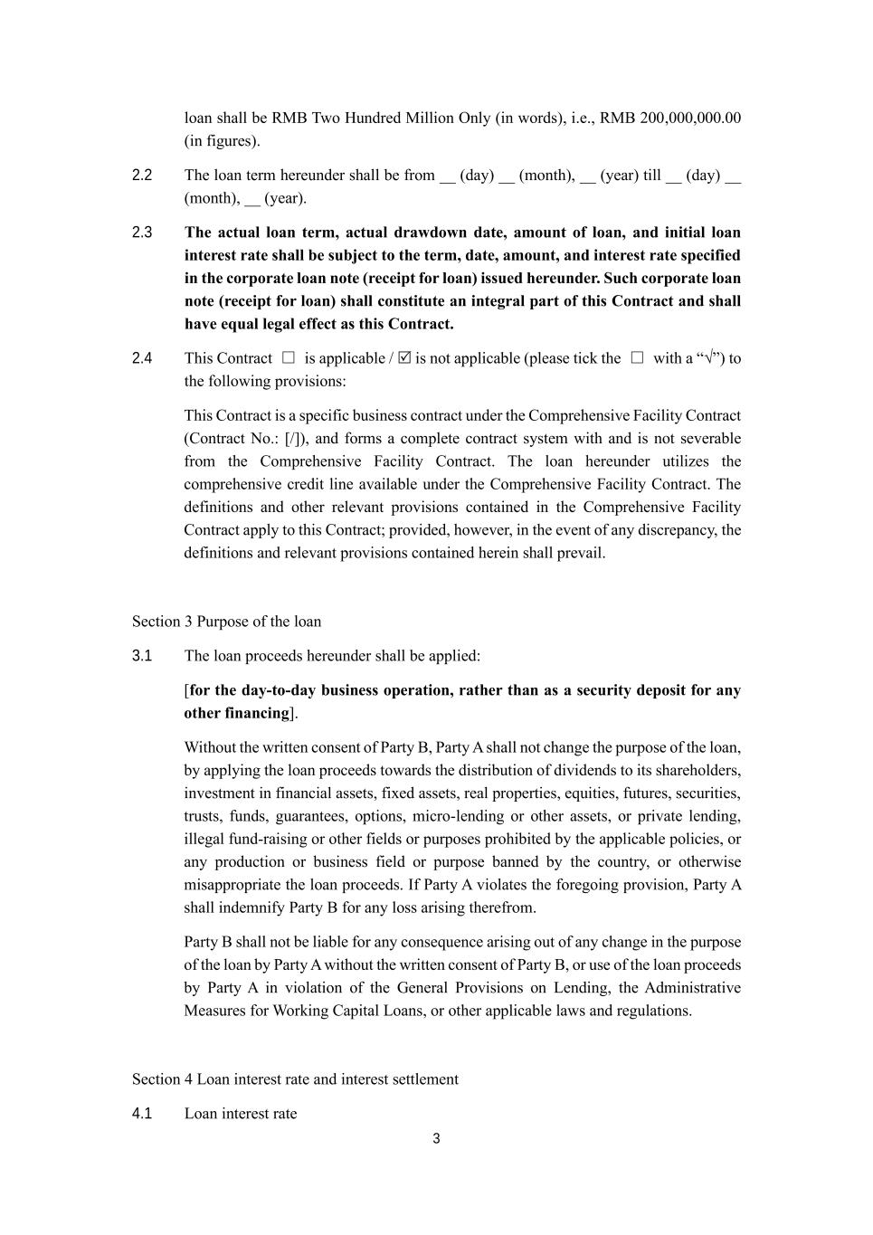 3 loan shall be RMB Two Hundred Million Only (in words), i.e., RMB 200,000,000.00 (in figures). 2.2 The loan term hereunder shall be from __ (day) __ (month), __ (year) till __ (day) __ (month), __ (year). 2.3 The actual loan term, actual drawdown date, amount of loan, and initial loan interest rate shall be subject to the term, date, amount, and interest rate specified in the corporate loan note (receipt for loan) issued hereunder. Such corporate loan note (receipt for loan) shall constitute an integral part of this Contract and shall have equal legal effect as this Contract. 2.4 This Contract □ is applicable /  is not applicable (please tick the □ with a “√”) to the following provisions: This Contract is a specific business contract under the Comprehensive Facility Contract (Contract No.: [/]), and forms a complete contract system with and is not severable from the Comprehensive Facility Contract. The loan hereunder utilizes the comprehensive credit line available under the Comprehensive Facility Contract. The definitions and other relevant provisions contained in the Comprehensive Facility Contract apply to this Contract; provided, however, in the event of any discrepancy, the definitions and relevant provisions contained herein shall prevail. Section 3 Purpose of the loan 3.1 The loan proceeds hereunder shall be applied: [for the day-to-day business operation, rather than as a security deposit for any other financing]. Without the written consent of Party B, Party A shall not change the purpose of the loan, by applying the loan proceeds towards the distribution of dividends to its shareholders, investment in financial assets, fixed assets, real properties, equities, futures, securities, trusts, funds, guarantees, options, micro-lending or other assets, or private lending, illegal fund-raising or other fields or purposes prohibited by the applicable policies, or any production or business field or purpose banned by the country, or otherwise misappropriate the loan proceeds. If Party A violates the foregoing provision, Party A shall indemnify Party B for any loss arising therefrom. Party B shall not be liable for any consequence arising out of any change in the purpose of the loan by Party A without the written consent of Party B, or use of the loan proceeds by Party A in violation of the General Provisions on Lending, the Administrative Measures for Working Capital Loans, or other applicable laws and regulations. Section 4 Loan interest rate and interest settlement 4.1 Loan interest rate